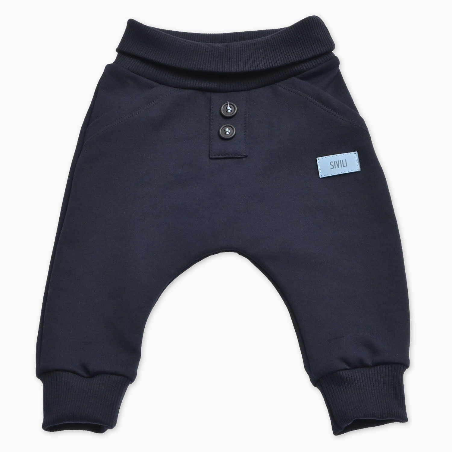 Temno modre kosmatene otroške baggy hlače z našitkom