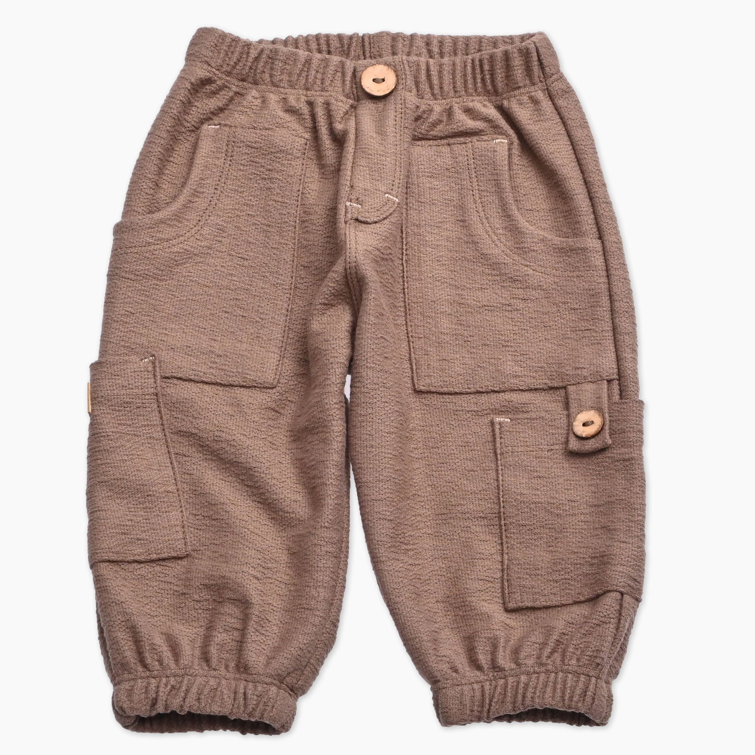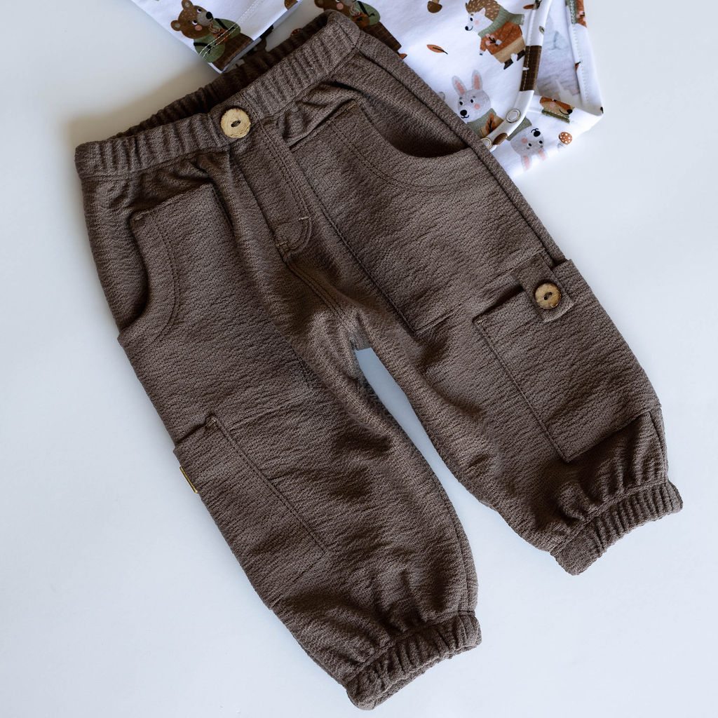 Otroške hlače za fanta z žepi, lesenimi gumbi in elastičnimi zaključki – temno rjava