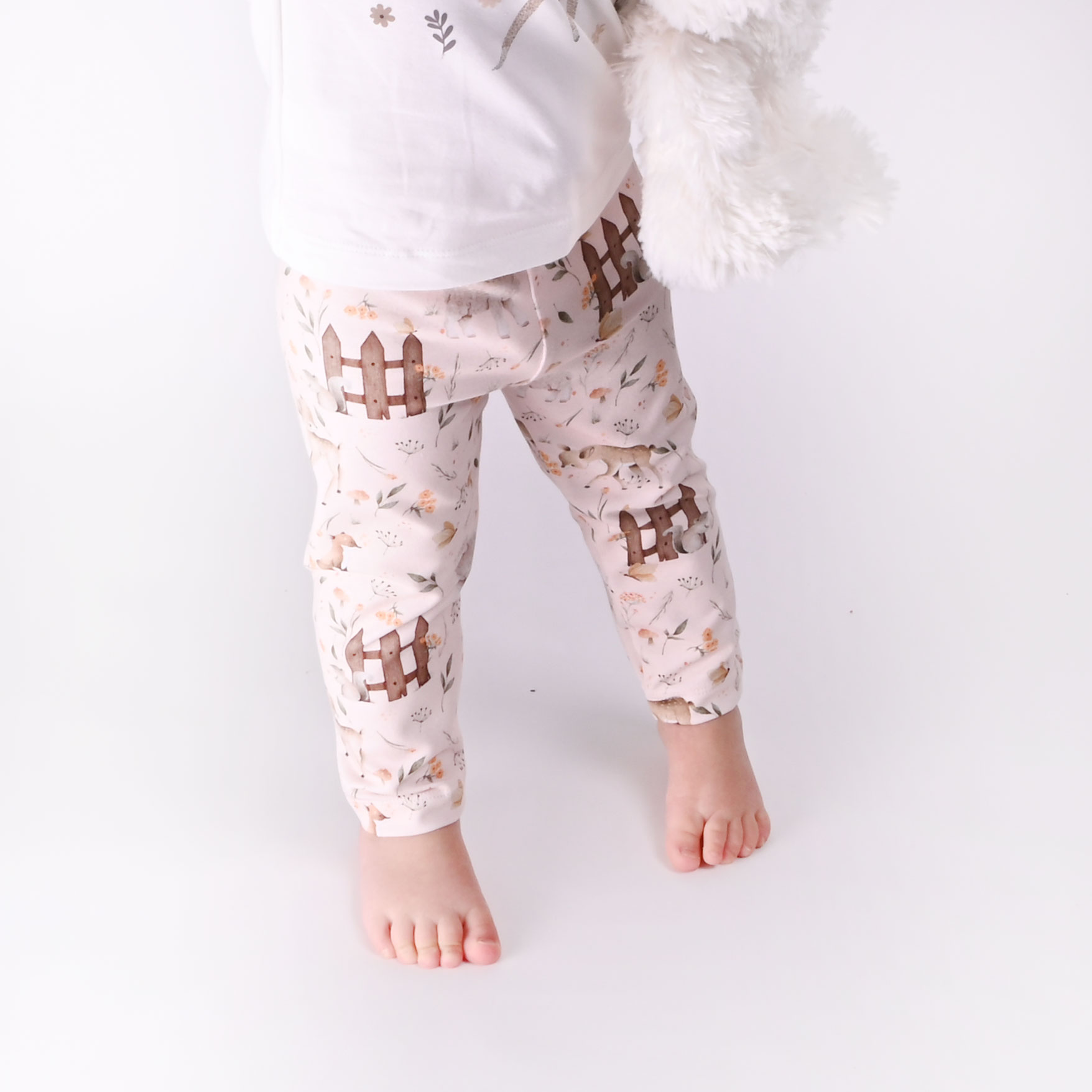 Otroške pajkice v nežni roza barvi s tiskom srnic in cvetlic so ustvarjene za udobje, gibanje in igriv videz vaše malčice. Mehka in elastična tkanina nežno objame otroško kožo ter omogoča popolno svobodo gibanja – primerne so za igro, počitek ali vsakodnevno uporabo.