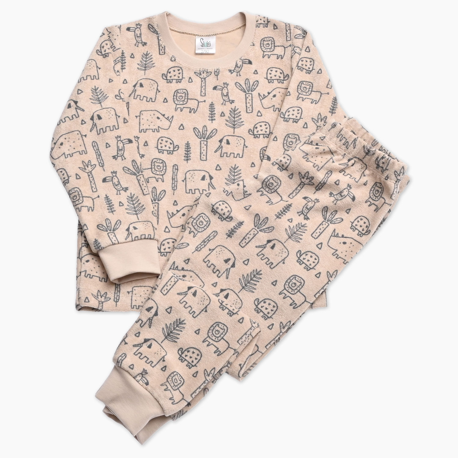 Bež otroška pižama iz frotirja s tiskom različnih živalic