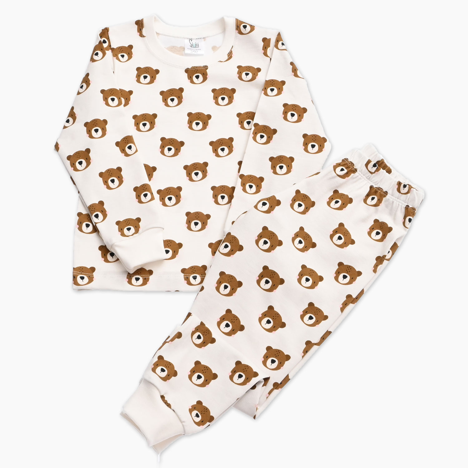 Pižama v nežni smetana barvi je okrašena s čudovitim tiskom medvedkov, ki vnese pridih igrivosti in topline. Zasnovana je z mislijo na udobje in gibanje – Ima elastične zaključke za vratom, na rokavih in hlačnicah, ki poskrbijo, da oblačilo lepo ostane na svojem mestu, ter mehko elastiko v pasu, ki ne tišči in omogoča popolno prileganje.