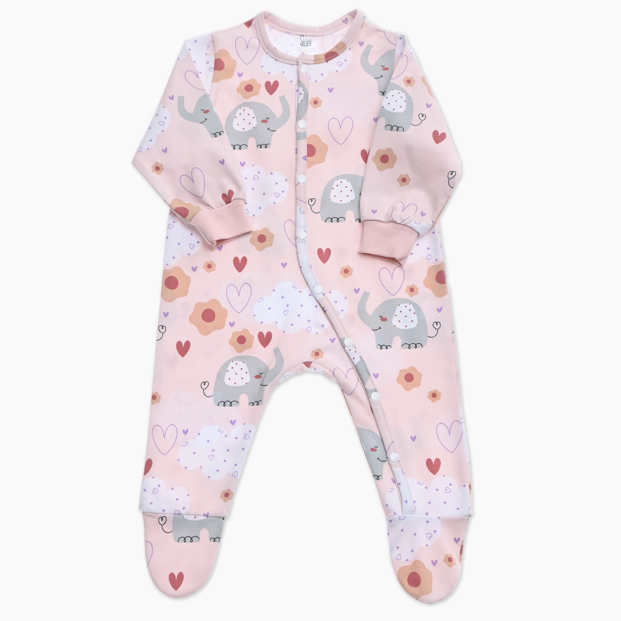 Pajac za dojenčka s stopali v roza barvi s tiskom slončkov