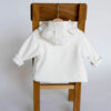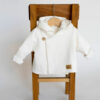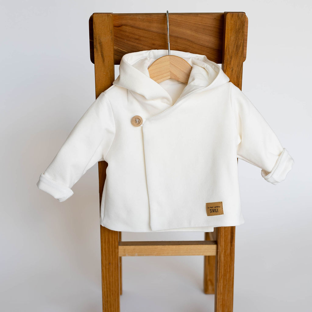 Naša jopica za dojenčke je popolna izbira za starše, ki cenijo udobje in kvalitetne materiale. Za izdelavo smo uporabili tkanini z veliko vsebnostjo bombaža v nežni smetana naravni barvi, kar pomeni, da je jopica idealna za preprosto kombiniranje.