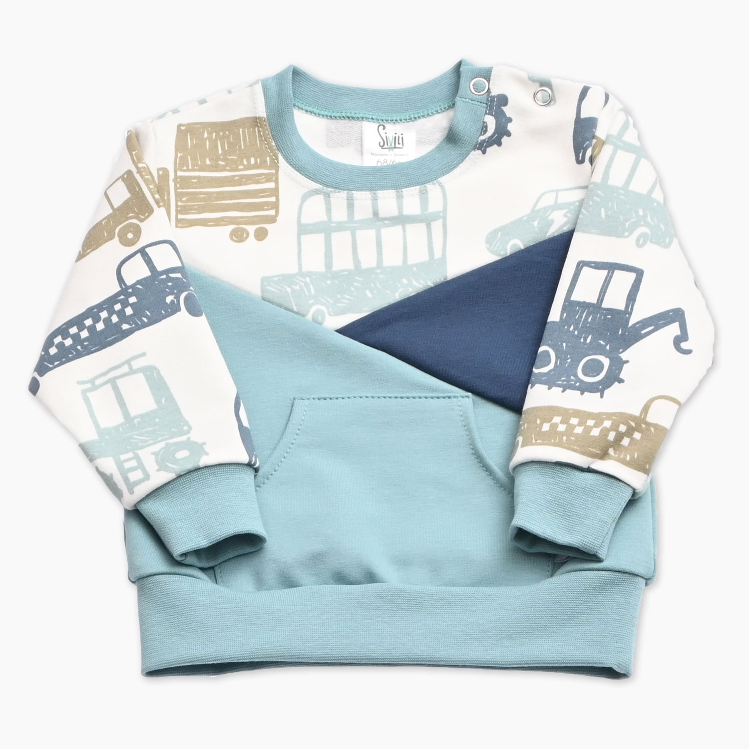 Pulover krasi simpatičen tisk vozil, ki doda kosu prepoznaven in zabaven značaj. Na sprednji strani ima velik žep, ki je praktičen za tople roke ali shranjevanje drobnih zakladov. Rokavi in pas so zaključeni z elastičnimi patenti, ki lepo ohranjajo obliko in preprečujejo vdor mraza.