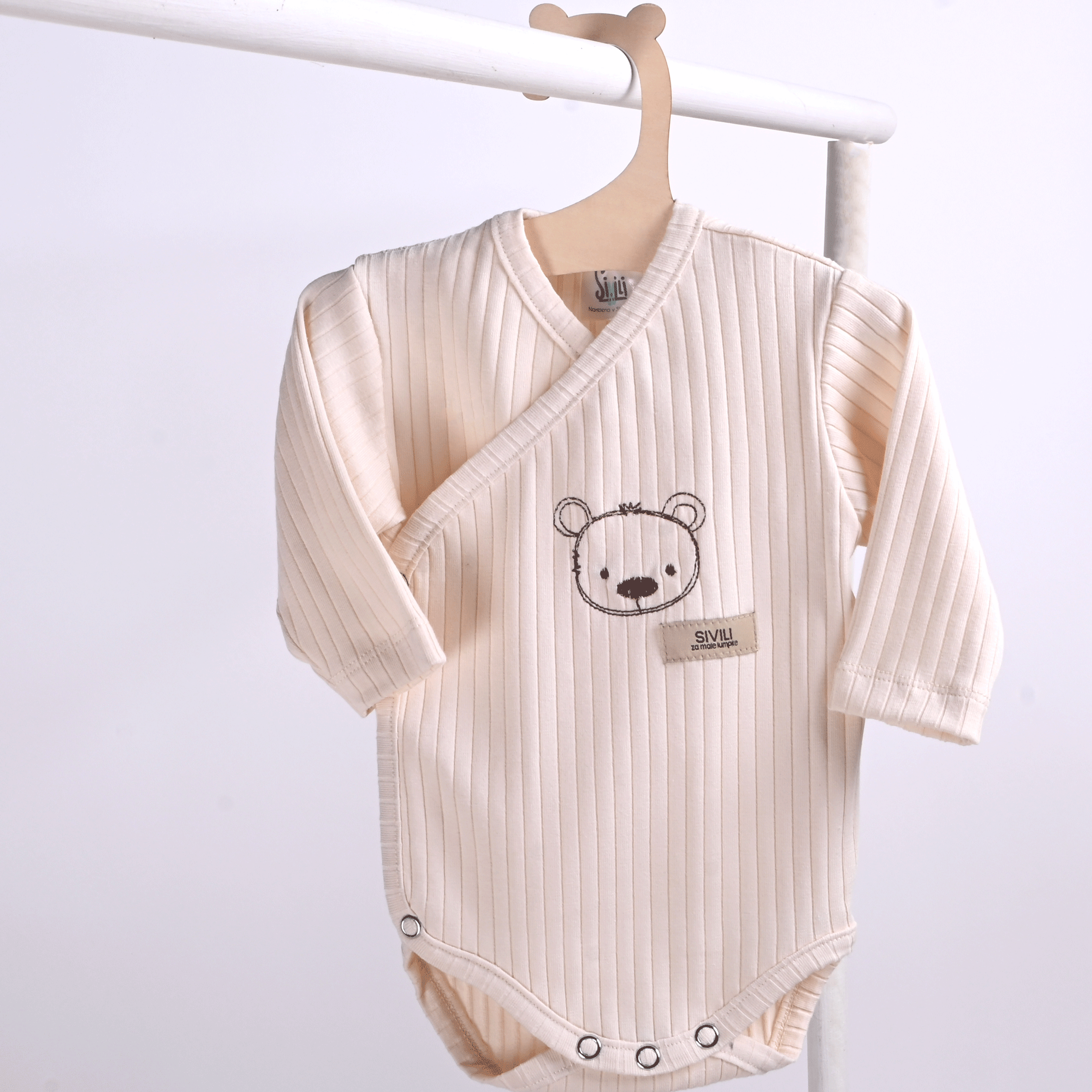 Otroški bodi na preklop v bež barvi iz rebraste tkanine in z vezenim medvedkom