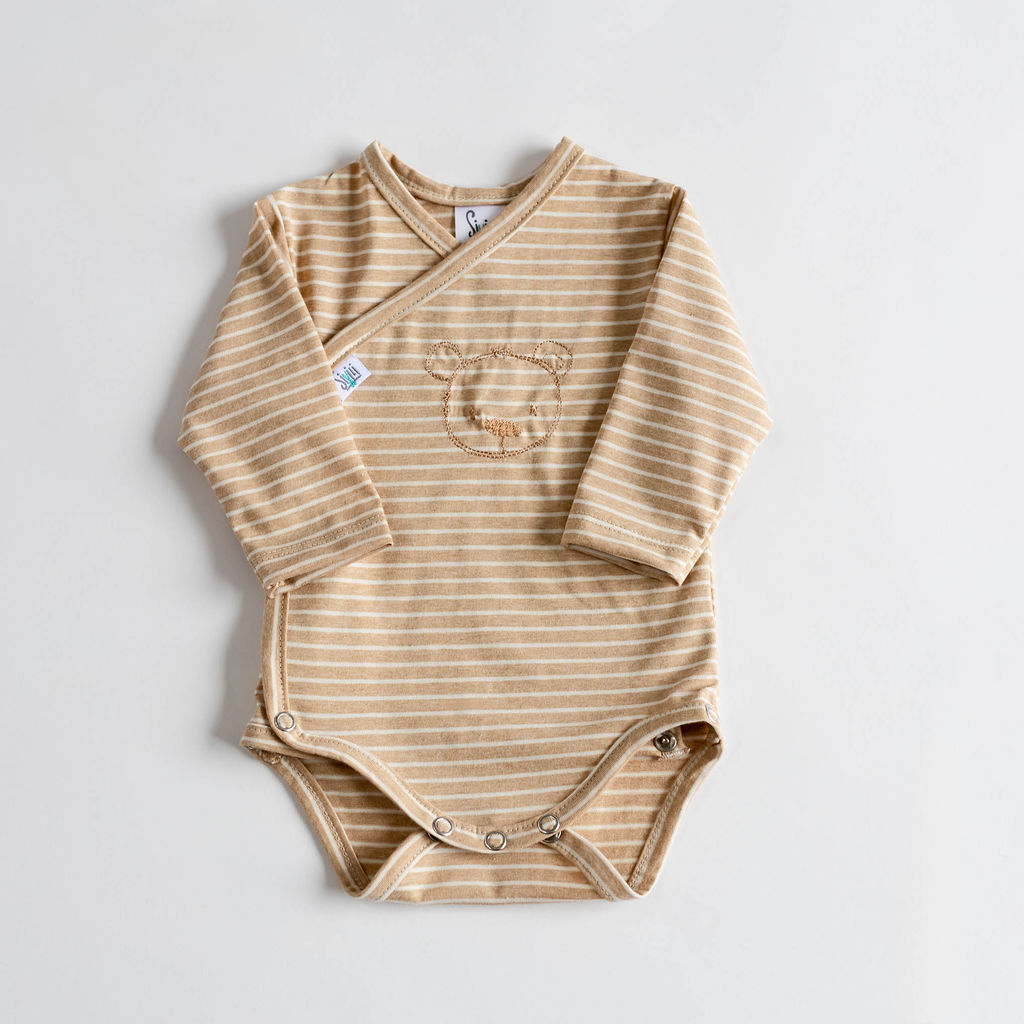 Naš bodi na preklop za dojenčka je popolna izbira za starše, ki cenijo udobje in naravne materiale. Za izdelavo smo uporabili tkanino iz 100 % biodinamičnega bombaža, kjer so pri izdelavi uporabili niti v različnih naravnih barvah bombaža. (smetana in lešnik). To pomeni da je bodi na preklop brez barvil zato je idealen za občutljivo otroško kožo.