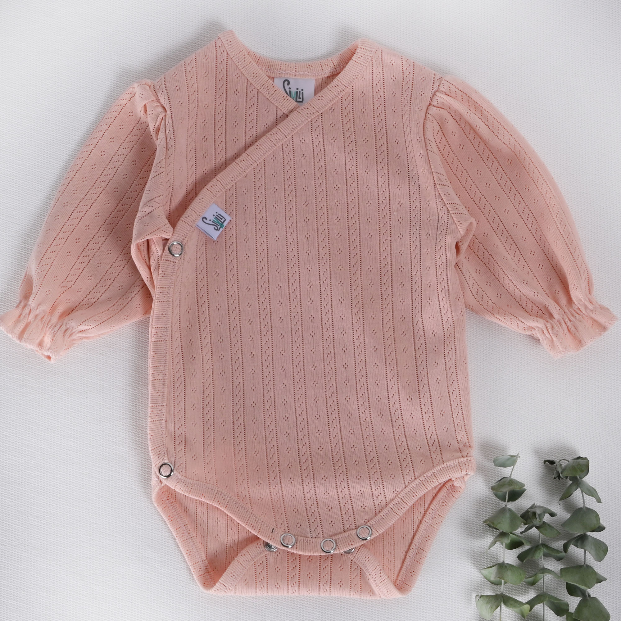 Otroški bodi na preklop za punčko v nežni marelični barvi združuje udobje, eleganco in funkcionalnost za prve mesece življenja. Subtilen vzorček v tkanini daje bodiju prefinjen in brezčasen videz, nabrani rokavčki pa dodajo nežen, romantičen poudarek.