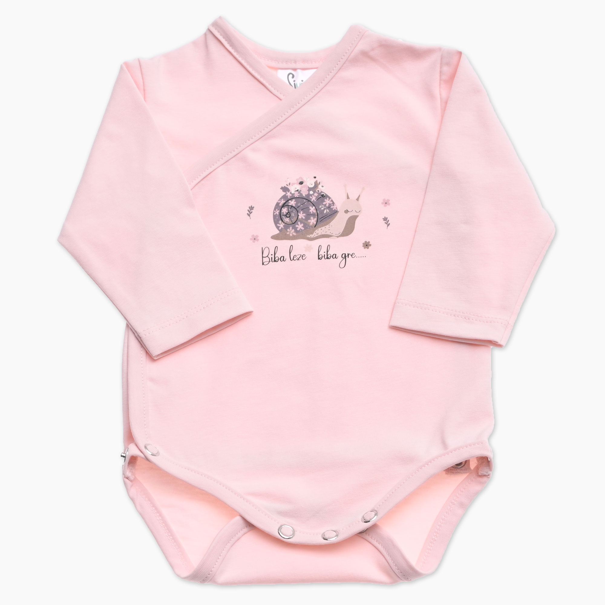 Otroški bodi na preklop v roza barvi s polžkom in slovenskim napisom BIBA LEZE, BIBA GRE