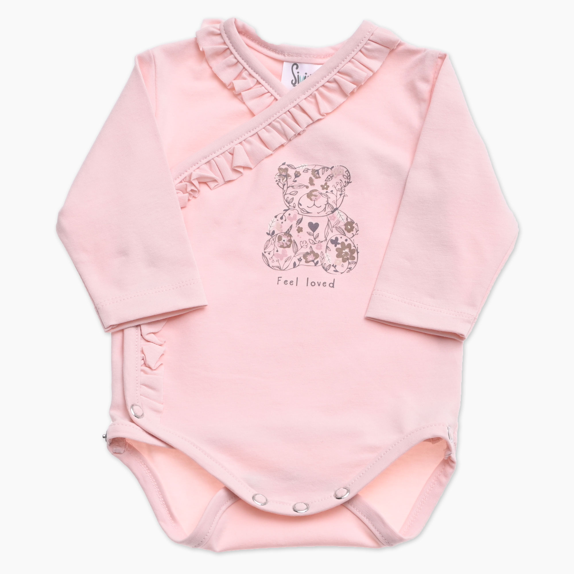 Otroški bodi na preklop v roza barvi z medvedkom in volančki