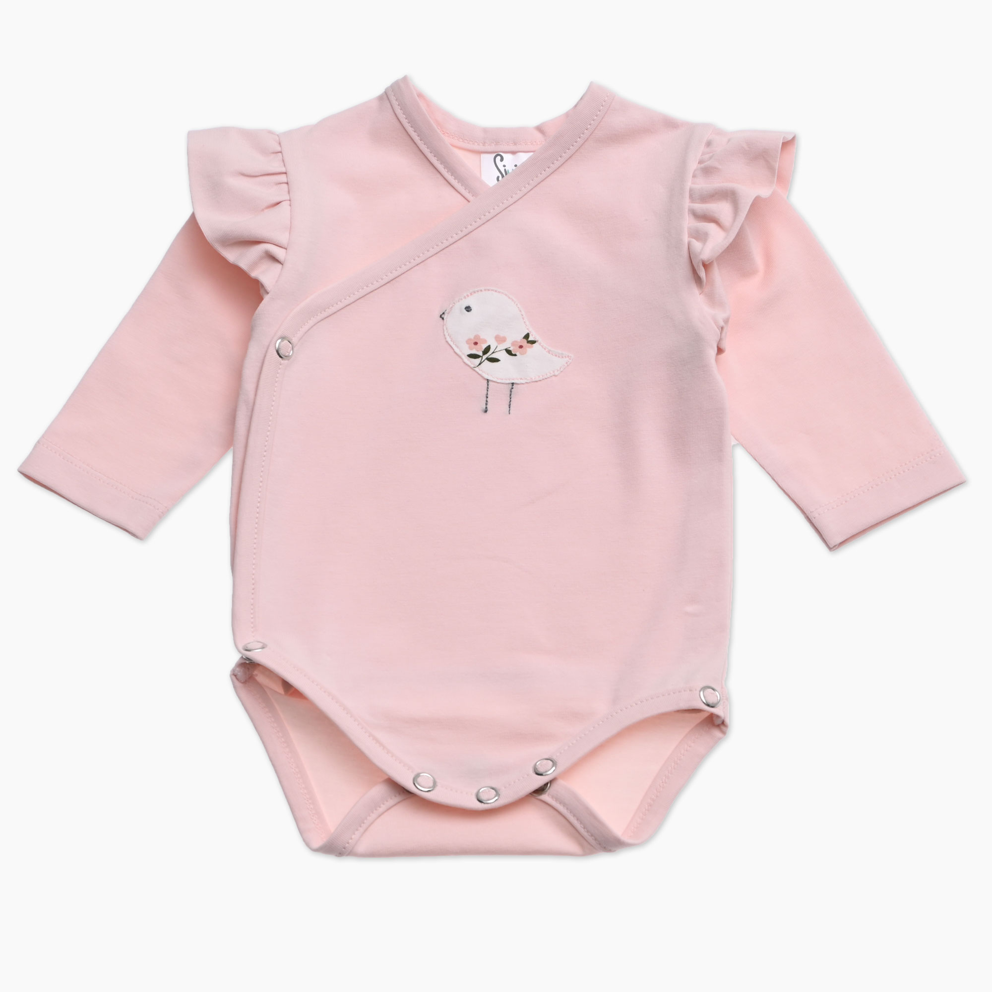 Marjana – - Roza otroški bodi na preklop s ptičkom in volančki