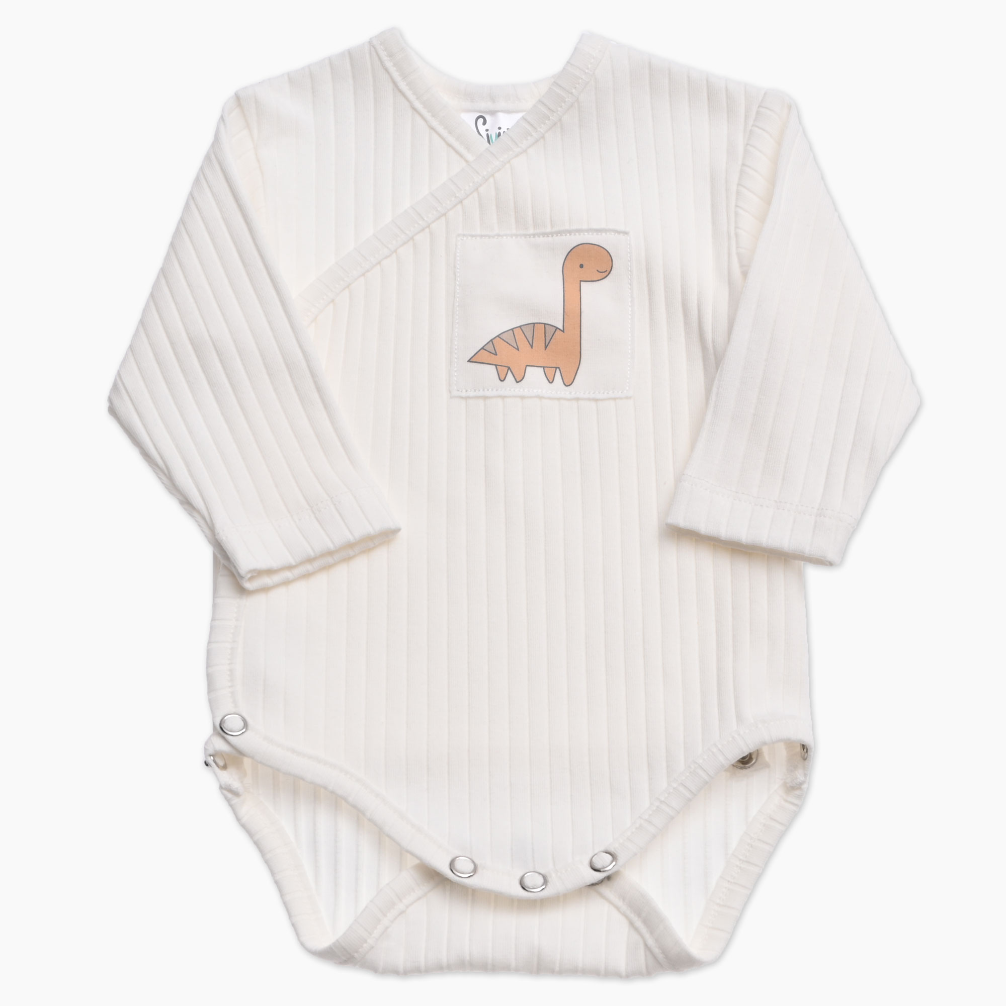 Otroški bodi na preklop v smetana barvi iz rebraste tkanine in s tiskom dinozavra