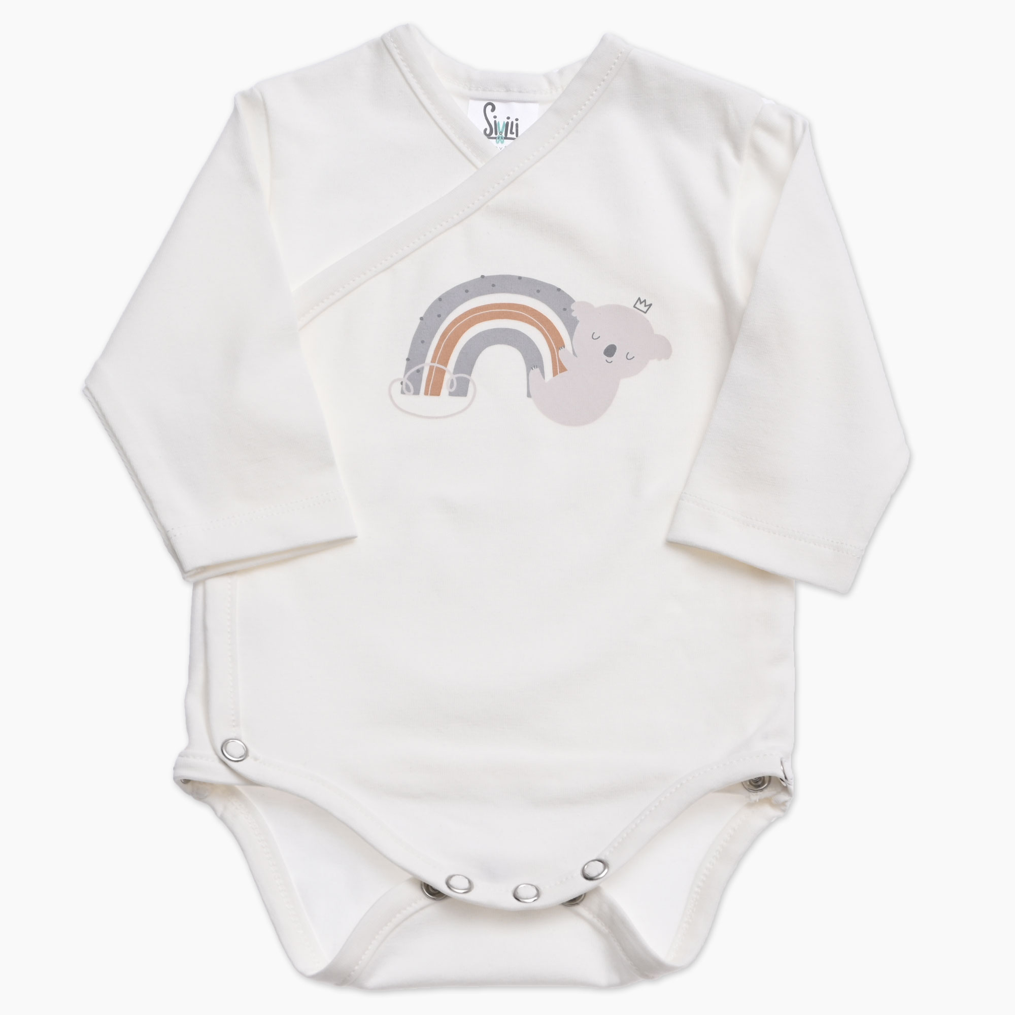 Otroški bodi na preklop v smetana barvi z medvedkom na mavrici