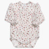Bodi je izdelan iz 100 % bombažne tkanine z nežnim vzorčkom v tkanini in dodatnim tiskom rožic, ki daje igriv in ljubeč videz, primeren za punčke. Rokavčki so na koncu nabrani, kar doda eleganten in lepši izgled bodija. Netki brez niklja zagotavljajo varno zapiranje brez draženja kože.