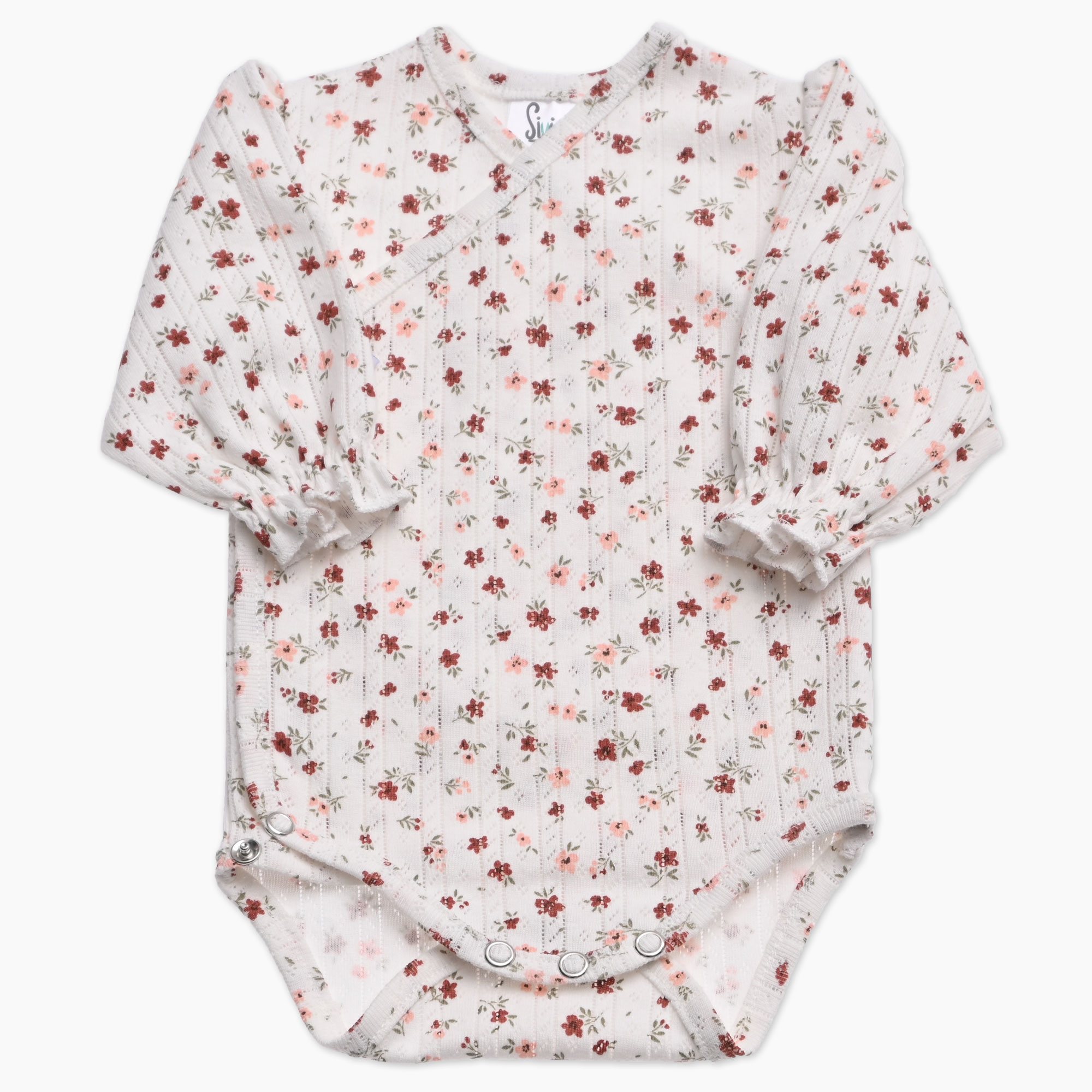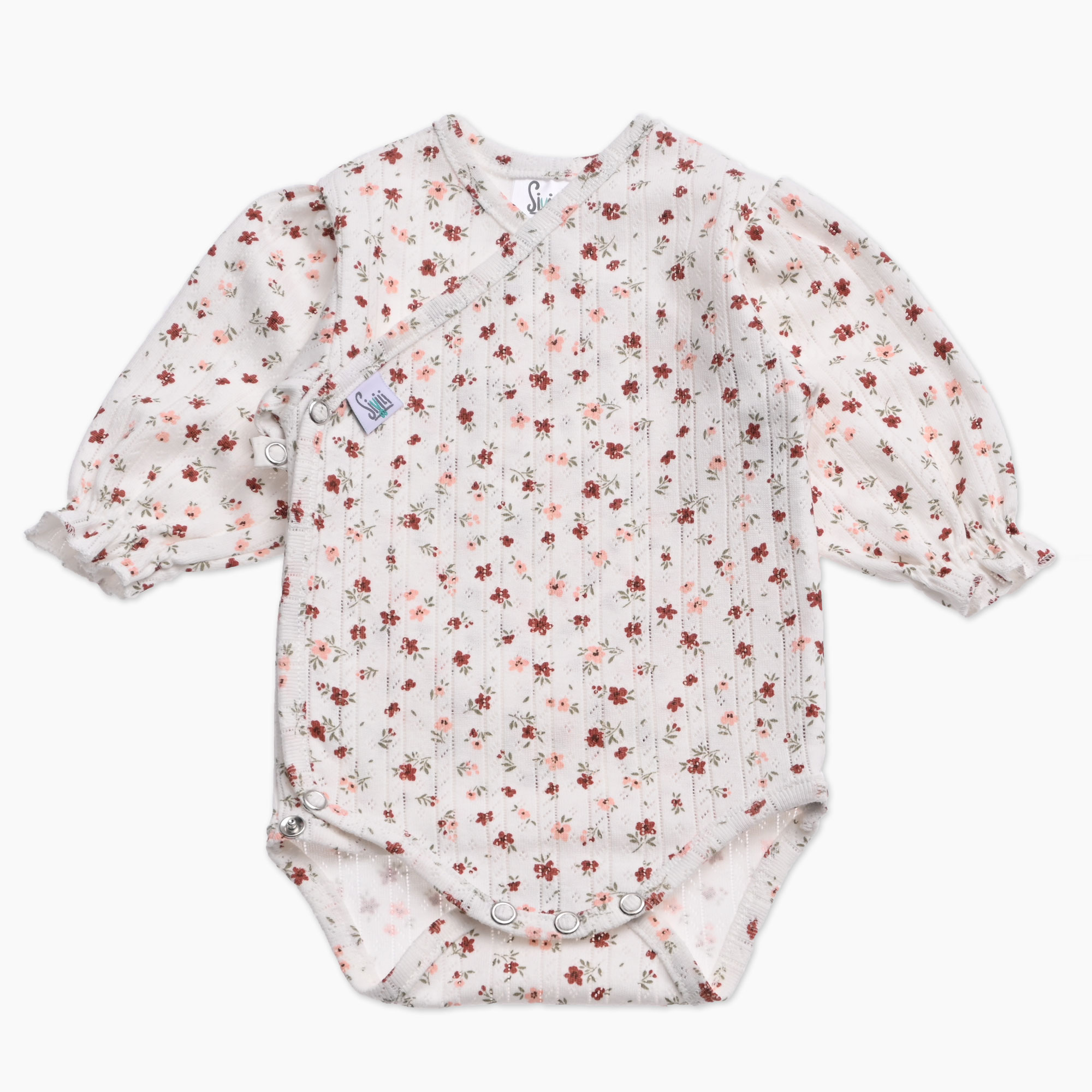Otroški bodi na preklop za punčko v smetana barvi z vzorčkom v tkanini in tiskom rožic