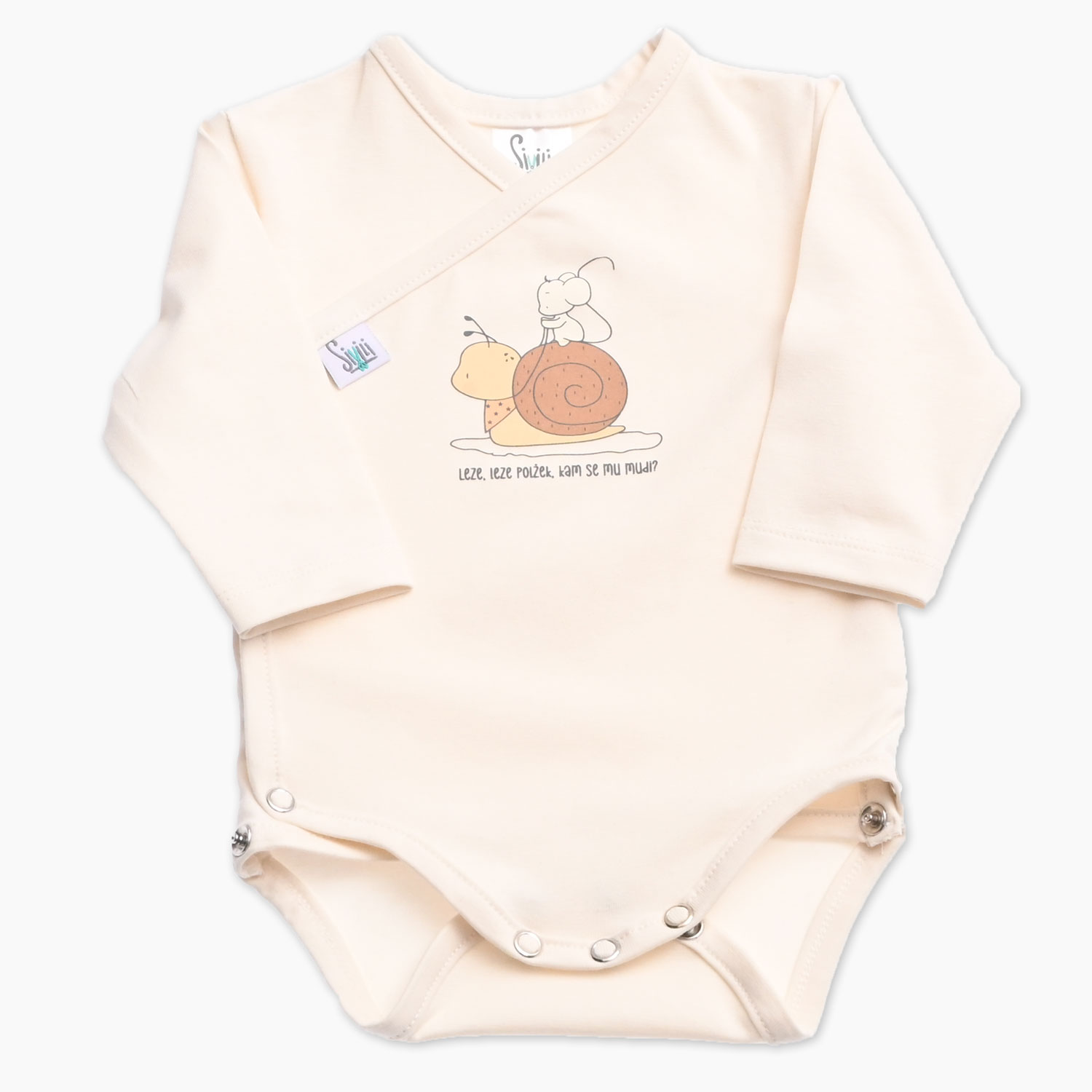 Otroški bodi na preklop v smetana barvi s tiskom polžka in slovenskim napisom LEZE, LEZEPOLŽEK. KAM SE MU MUDI?