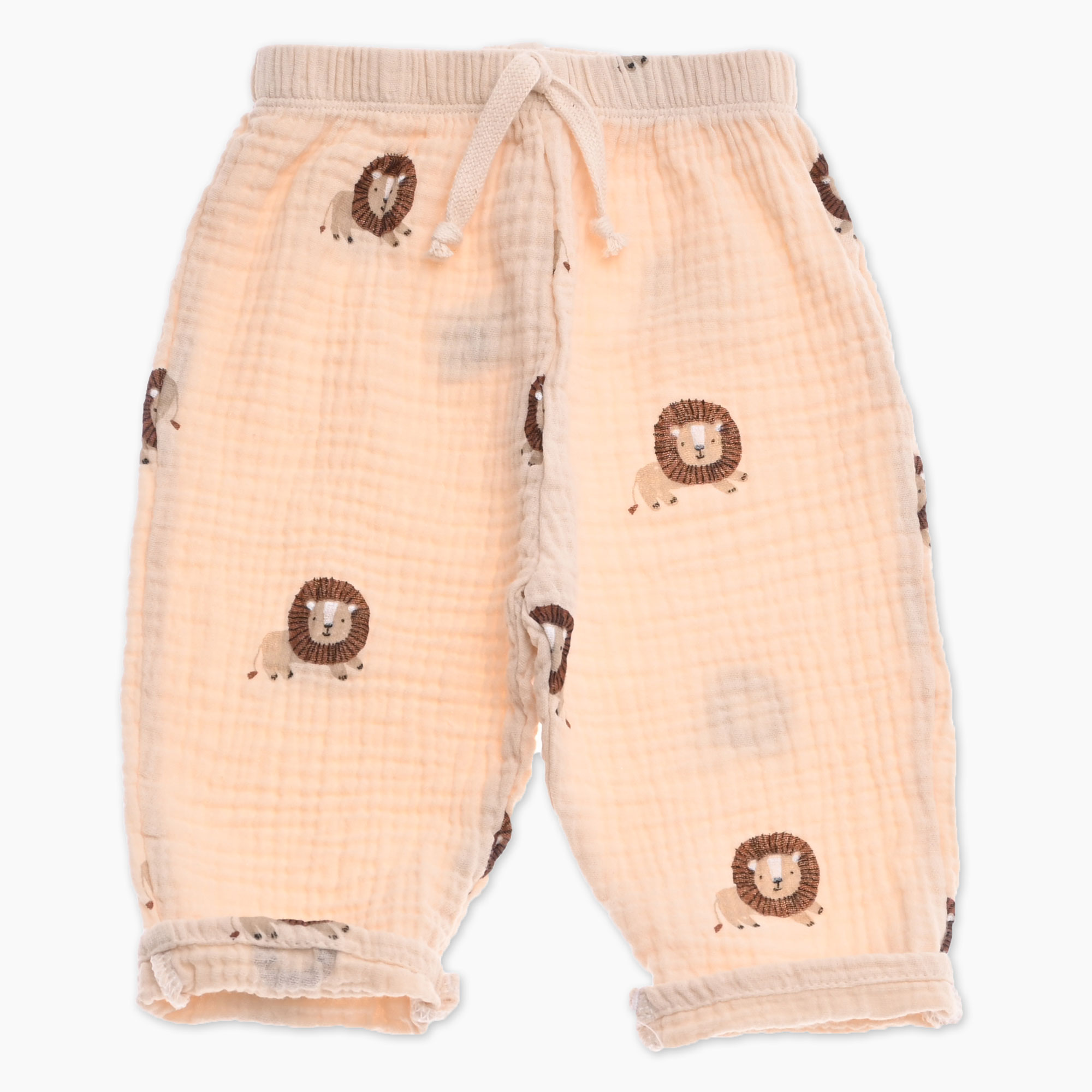 Otroške baggy hlače v bež barvi s tiskom nagajivih levov. Narejeno v Sloveniji