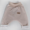 Hlače imajo elastične patente v pasu, ki omogočajo enostavno oblačenje in dobro prileganje brez tiščanja. Sprednji žep doda nežen oblikovni poudarek, hkrati pa ohranja minimalističen videz. Posebnost tega modela so hlačnice, ki se lahko zavihajo s katerimi lahko dolžino prilagodite otroku – hlače tako rastejo skupaj z njim in omogočajo daljšo uporabo.