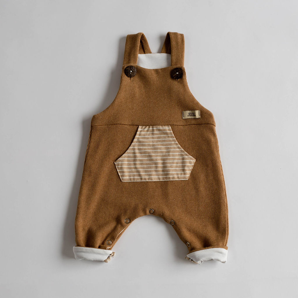 Naše hlače z naramnicami za dojenčka so popolna izbira za starše, ki cenijo udobje in naravne materiale. Za izdelavo smo uporabili tkanine iz 100 % biodinamičnega bombaža v lešnik naravni barvi8vrhnja plast), enobarvna smetana(notranja podloga) in črtice(žepek), kar pomeni, da so hlače brez barvil zato so idealne za občutljivo otroško kožo.
