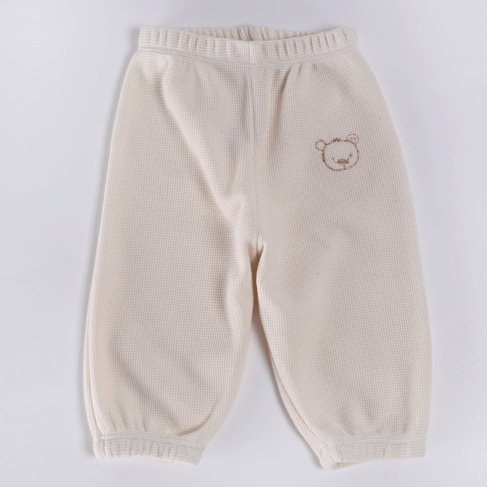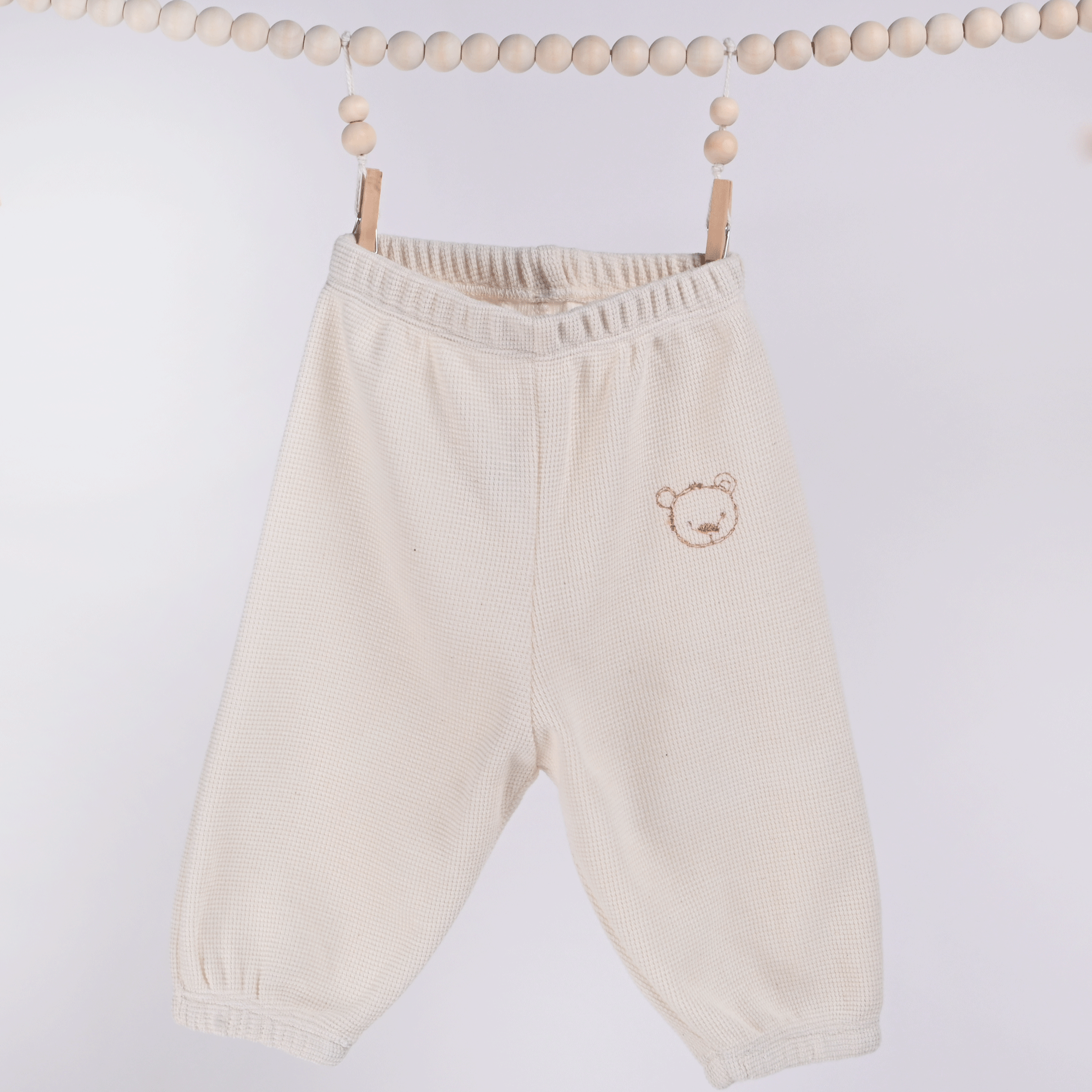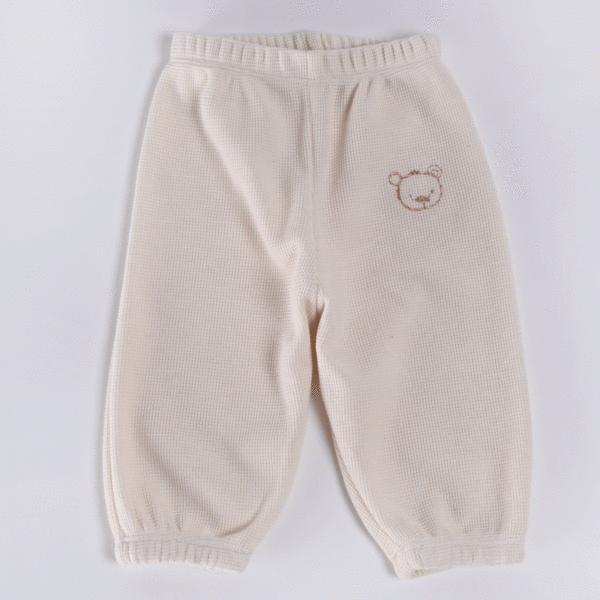 Hlače imajo se v pasu in na koncu hlačnic zaključijo z elastiko, ki je natančno všita v mehko naravno bombažno tkanino, ki poskrbi za udobje in prijeten občutek. Vezen medvedek pa hlačam doda naraven videz in piko na i pri izgledu!