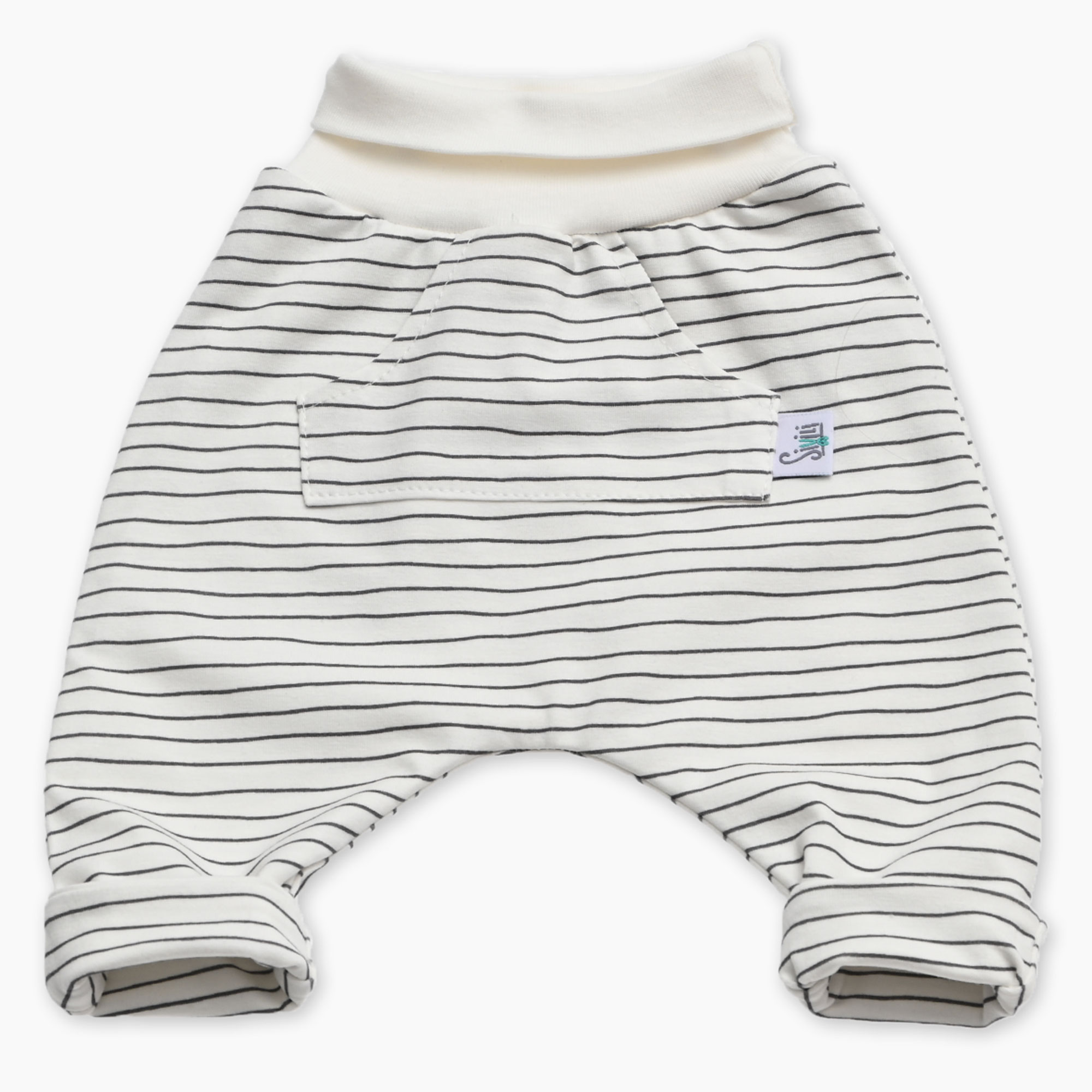 Otroške baggy hlače iz smetana tkanine z žepkom in tiskanimi temno sivimi črtami