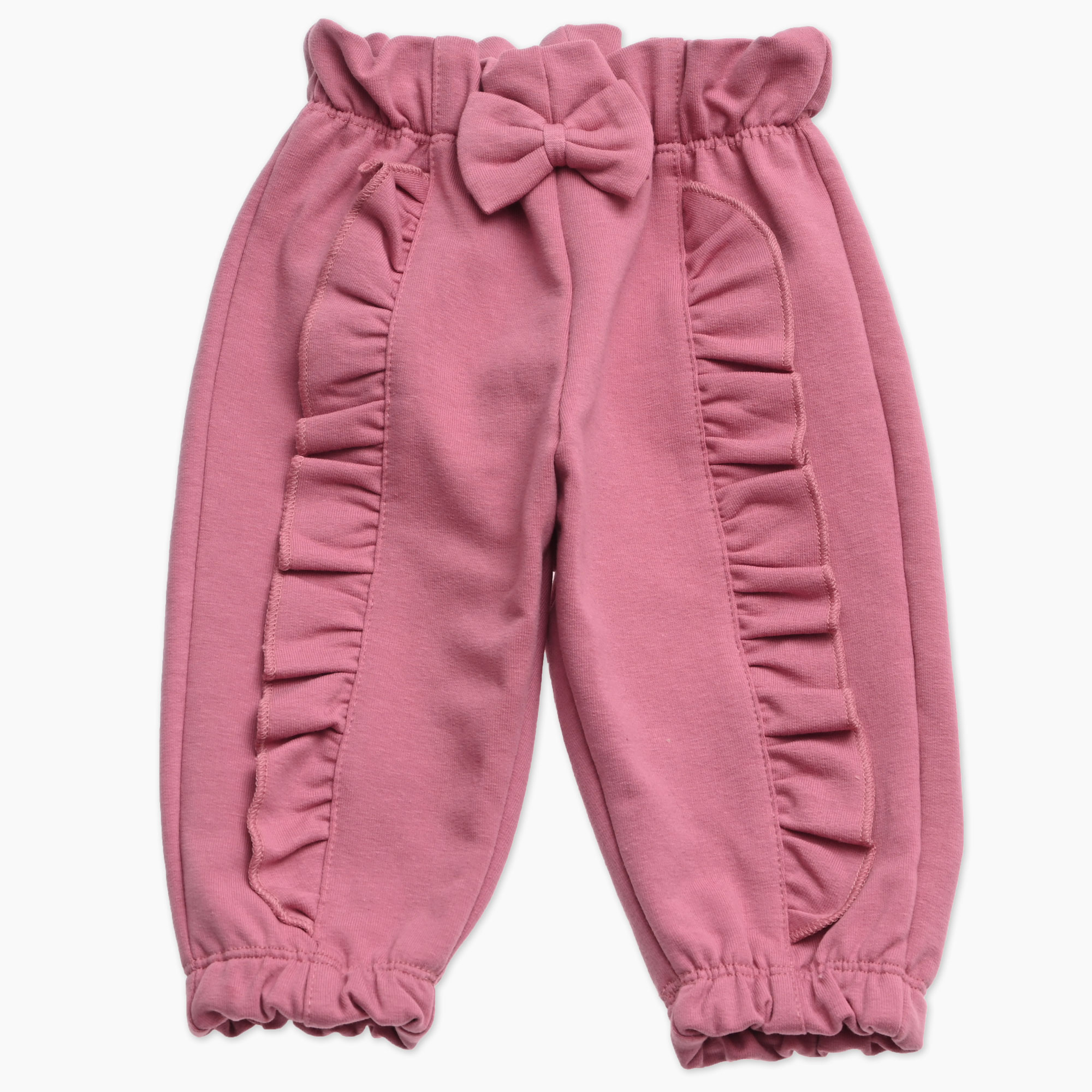 Otroške baggy hlače iz umazano roza tkanine z mašno v pasu in volančki