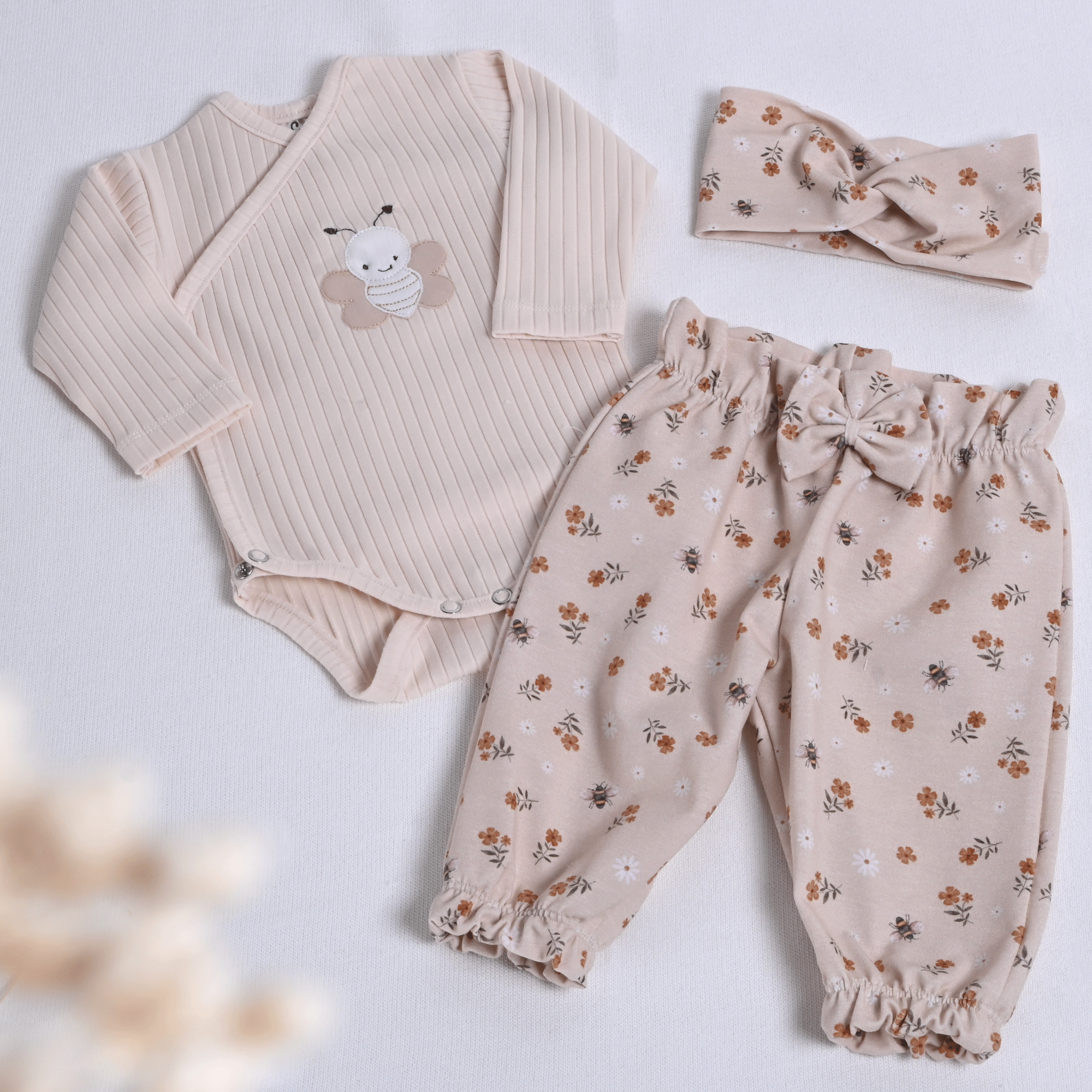 Otroški komplet za novorojenčke v bež barvi s tiskom čebelic in vezeno čebelico