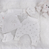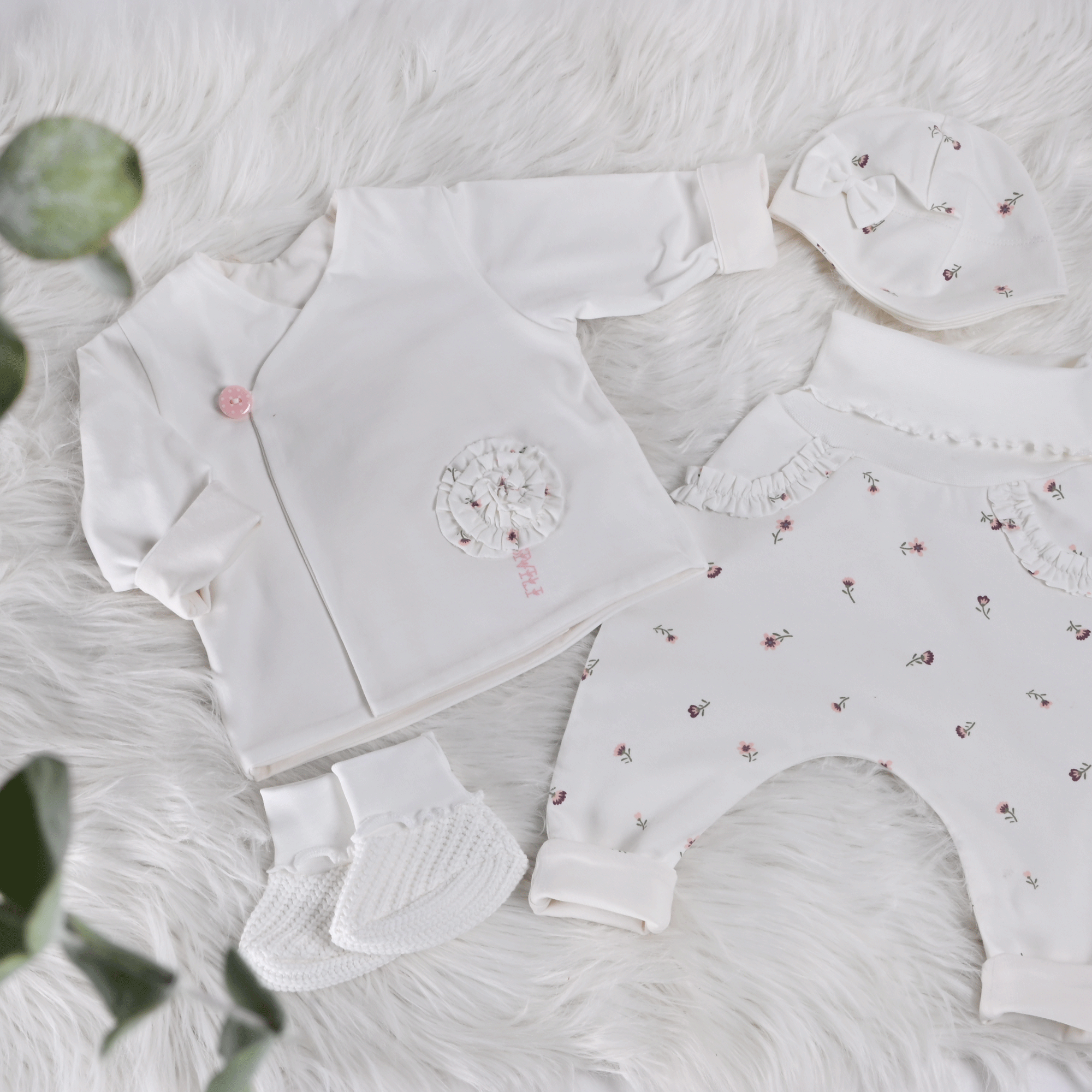 Komplet za novorojenčka z jopico, kapico in copatki v smetana barvi in rožicami na hlačah