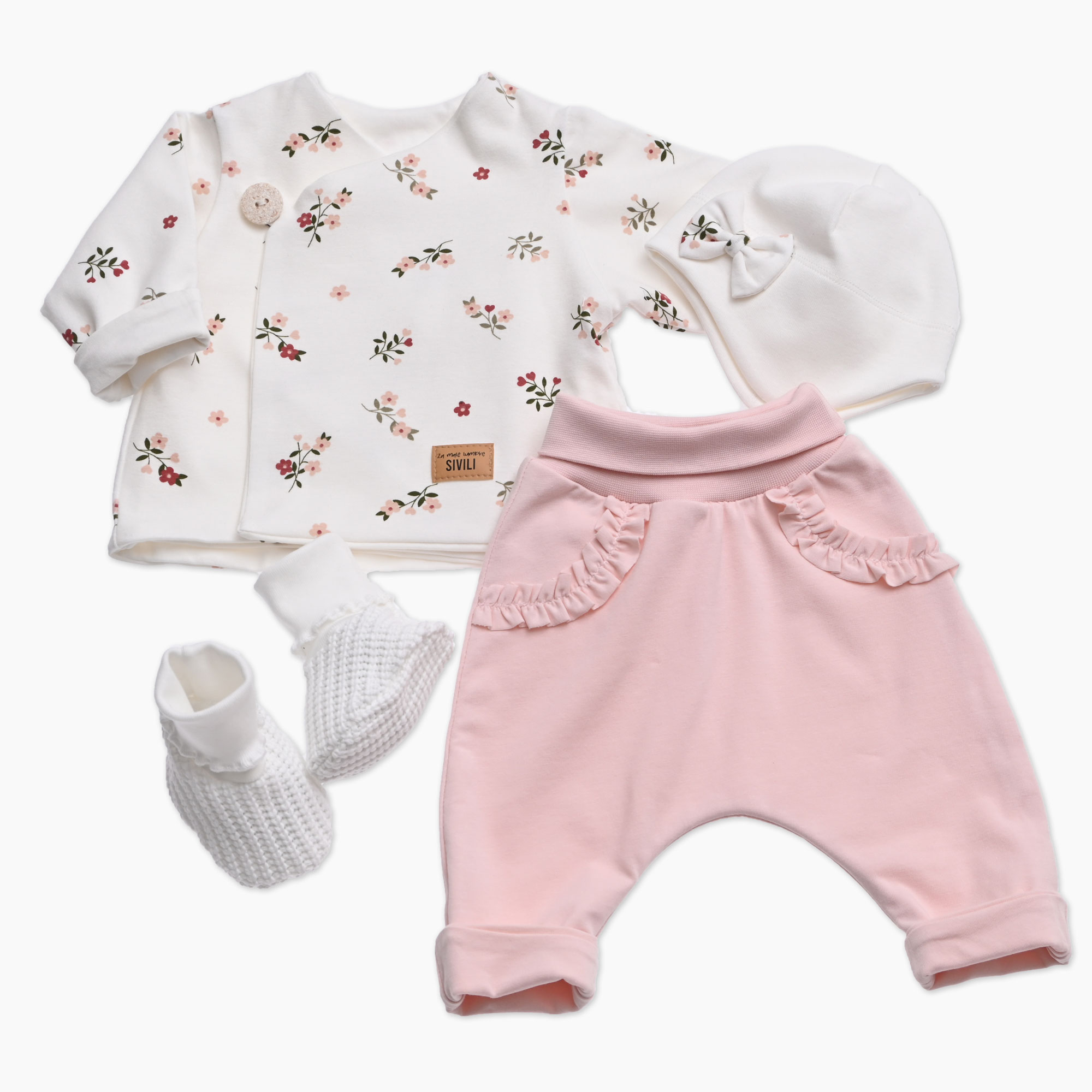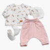 Komplet za novorojenčka z jopico s potiskanimi rožicami, smetana kapico in copatki, ter roza hlačami