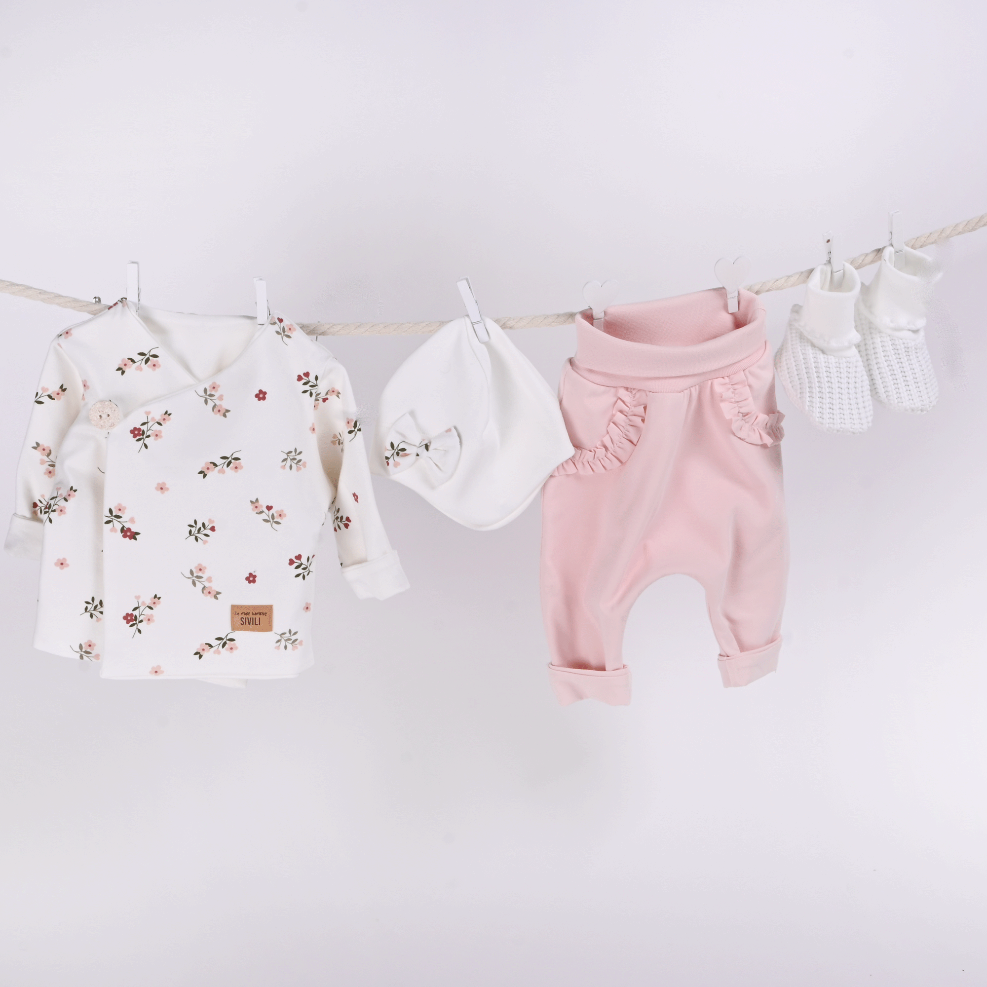 Komplet je primeren za vsakodnevno nošenje, prve obiske ali kot posebno darilo ob rojstvu. Izdelan je v majhni seriji, z velikim poudarkom na kakovosti, uporabnosti in varnosti.