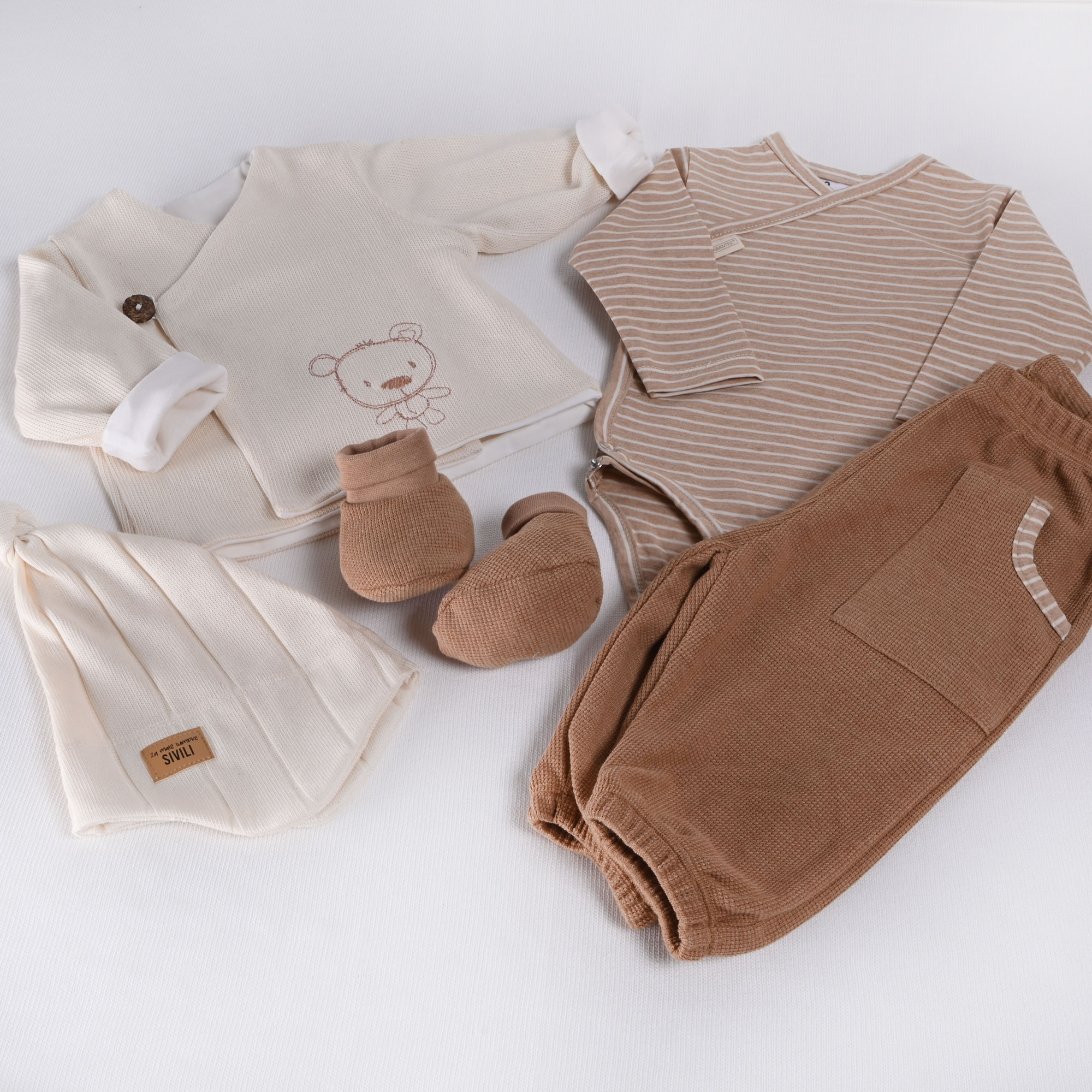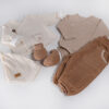 Naš komplet za novorojenčke je popolna izbira za vse, ki cenijo udobje in naravne materiale. Za izdelavo smo uporabili le tkanine iz 100 % biodinamičnega bombaža, ki so pletene iz različnih barv bombažnih niti. To pomeni, da je komplet popolnoma brez barvil zato je idealen za občutljivo in nežno otroško kožo.