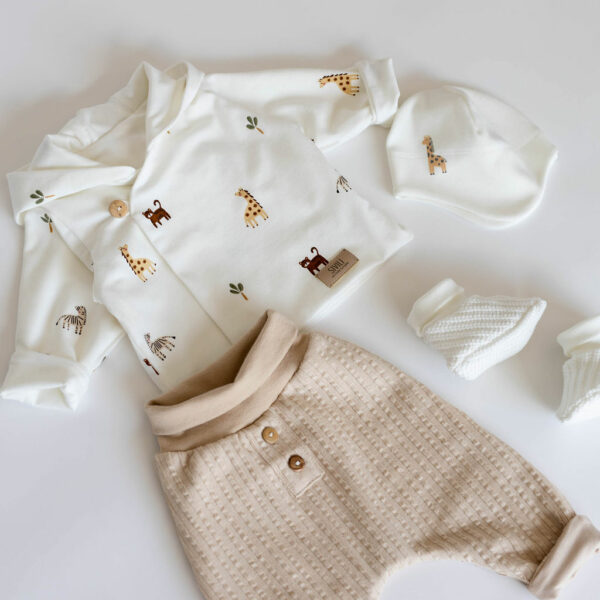 Komplet za novorojenčke v smetana in bež barvi z žirafo