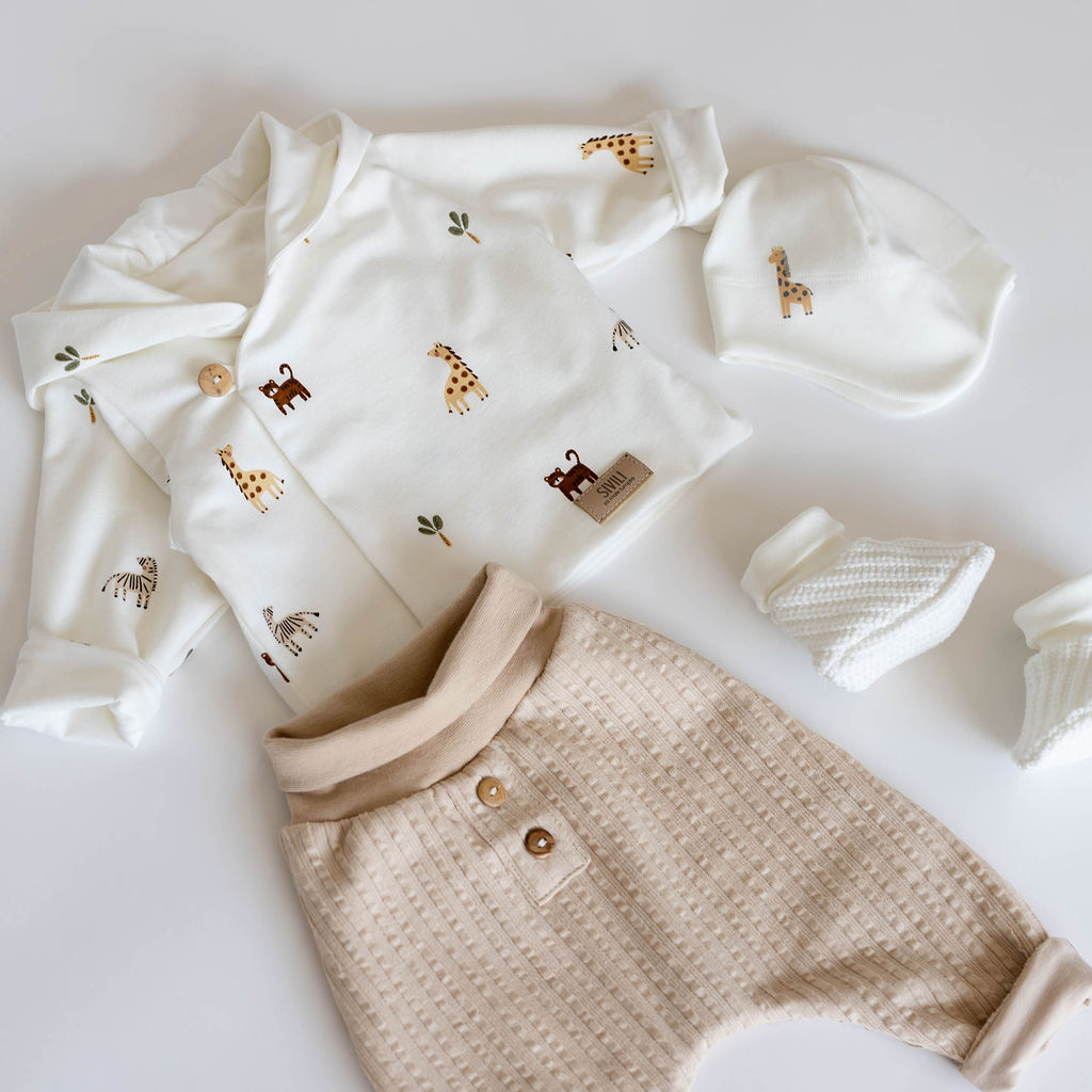 Čudovit in izjemno nežen bombažen komplet za novorojenčke je popolna izbira za prve dni življenja – za domače udobje, obisk porodnišnice, ali kot skrbno izbrano darilo ob rojstvu.