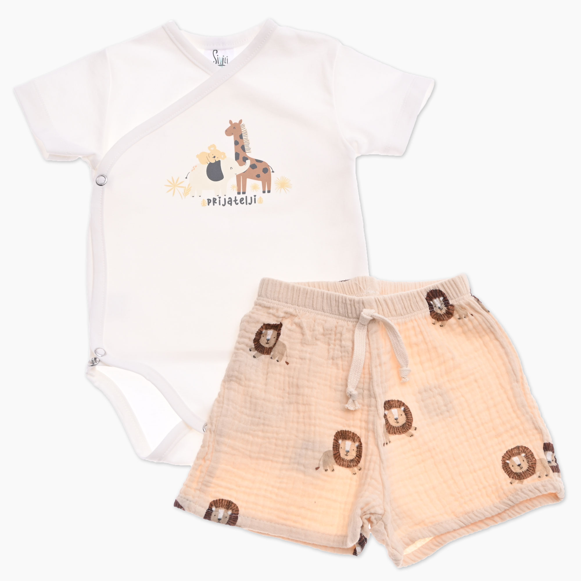 Otroški komplet za dojenčka z bež kratkimi hlačami s tiskom levov in bodijem na preklop v smetana barvi s tiskom PRIJATELJEV. Izdelano v Slovenij