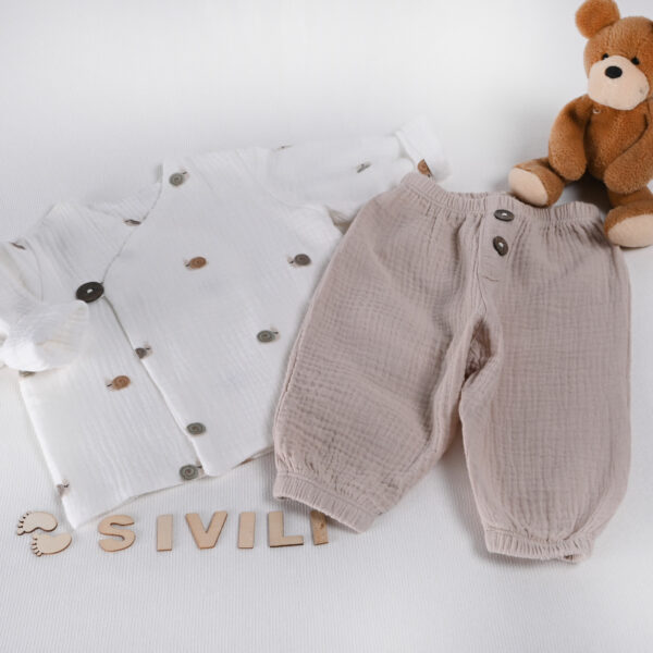 Komplet je izdelan iz 100 % bombažnega muslina, ki je izjemno mehak, lahek in prijazen do občutljive kože novorojenčkov. Jopica se zapenja z lesenimi gumbki, ki omogočajo enostavno oblačenje in dodajo naraven, estetski detajl. Zračen material zagotavlja udobje skozi ves dan in omogoča nemoteno gibanje.