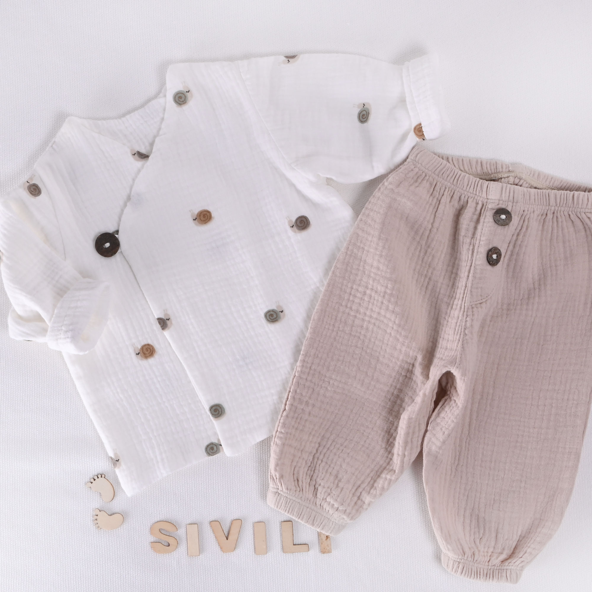 Nežen muslin komplet za novorojenčke je popolna izbira za prve dni dojenčka, saj združuje udobje, zračnost in brezčasen dizajn. Jopica s tiskom ljubkih polžkov in bež hlače ustvarjajo harmonično in umirjeno barvno kombinacijo, ki je primerna tako za deklice kot dečke.