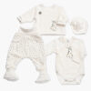 Komplet vsebuje kar 5 ujemajočih se kosov, izdelanih iz mehke bombažne tkanine prijazne do občutljive dojenčkove kože.