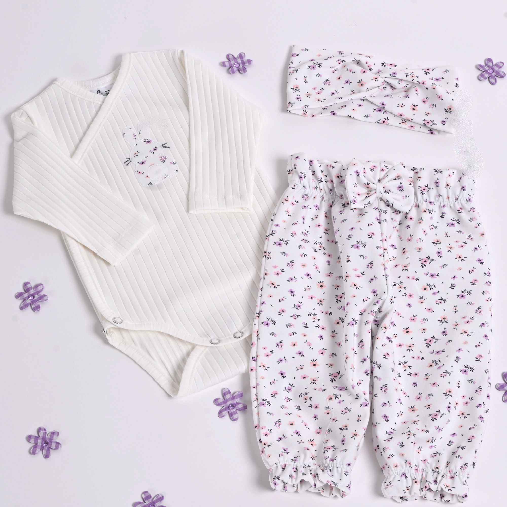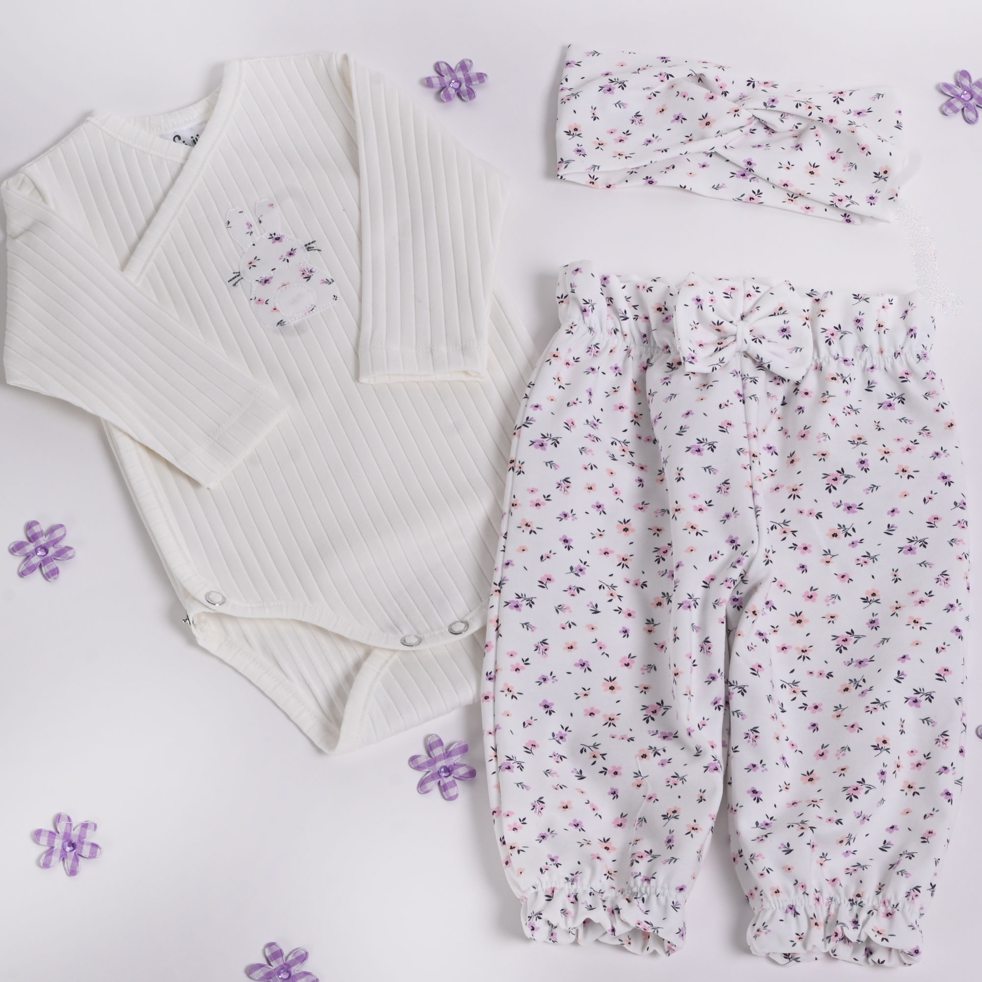 Komplet za novorojenčke – z vezenim zajčkom, rožicami in ljubkimi detajli