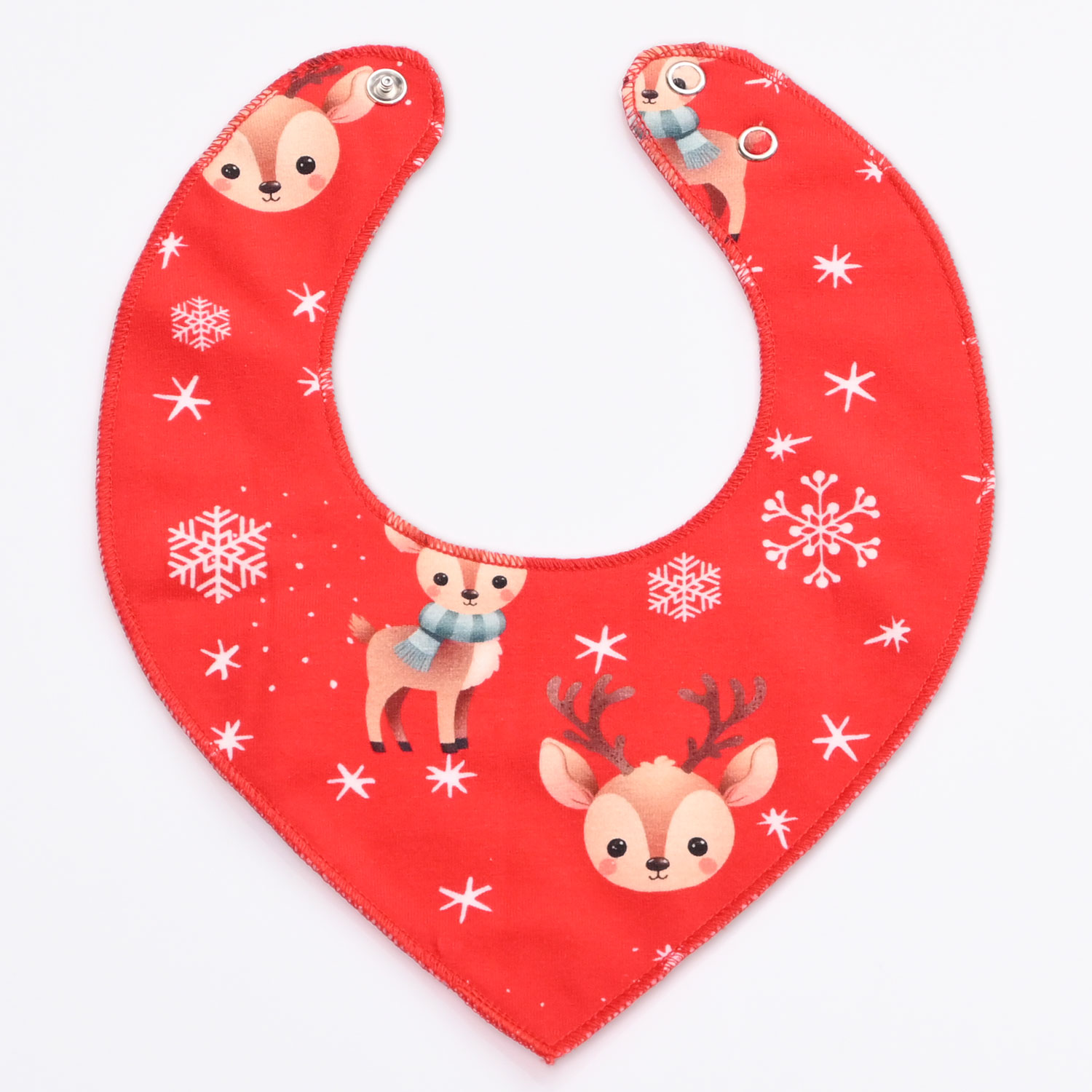 Zgornjo in spodnjo plast krasi prisrčen tisk jelenčkov in snežink, ki poskrbi za ljubek, otroški videz in popestri vsak dan. Slinček se zapenja z netki brez niklja, ki omogočajo nastavljanje obsega okrog vratu, zato se lepo prilega različnim starostim in ne draži kože.