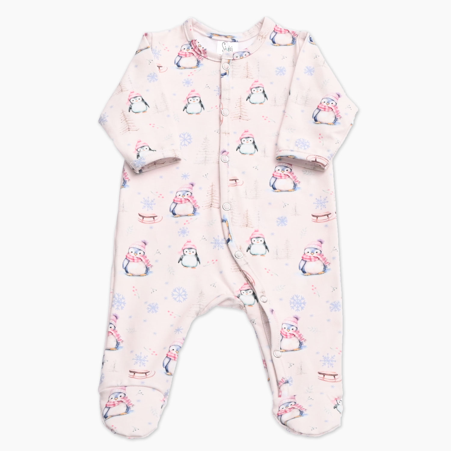 Pajac je v nežni smetana barvi in okrašen s sladkim tiskom pingvinov, kar ustvarja igriv in ljubek videz. Za enostavno oblačenje in previjanje se pajac po dolžini zapenja z netki brez niklja, ki so prijazni do kože, pajac pa ima tudi stopalca, ki poskrbijo za toplino in zaščito nogic.