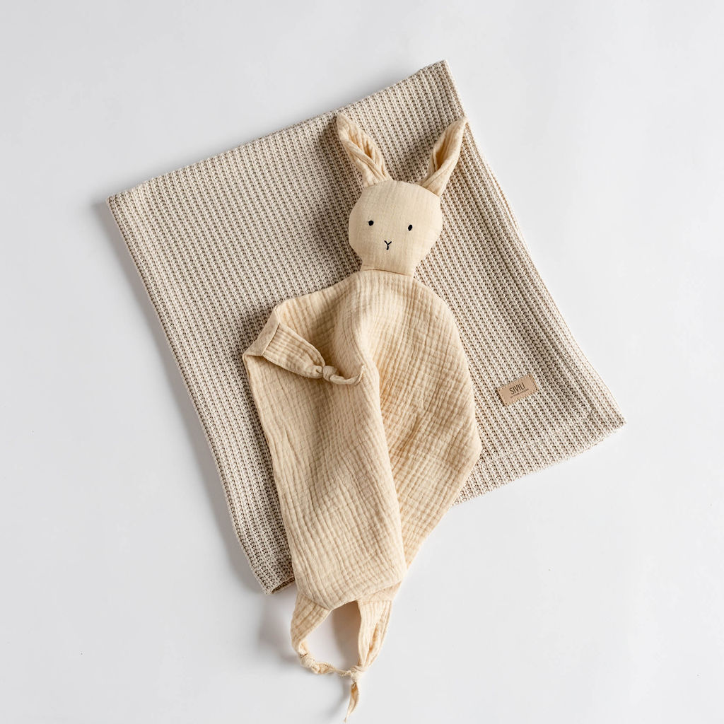 Čudovita ideja za prvo darilo in nežne vsakodnevne trenutke. Lahka, naravna in nežna tolažba s svojo simpatično obliko zajčka ponuja občutek varnosti, toplino in igrivost.