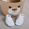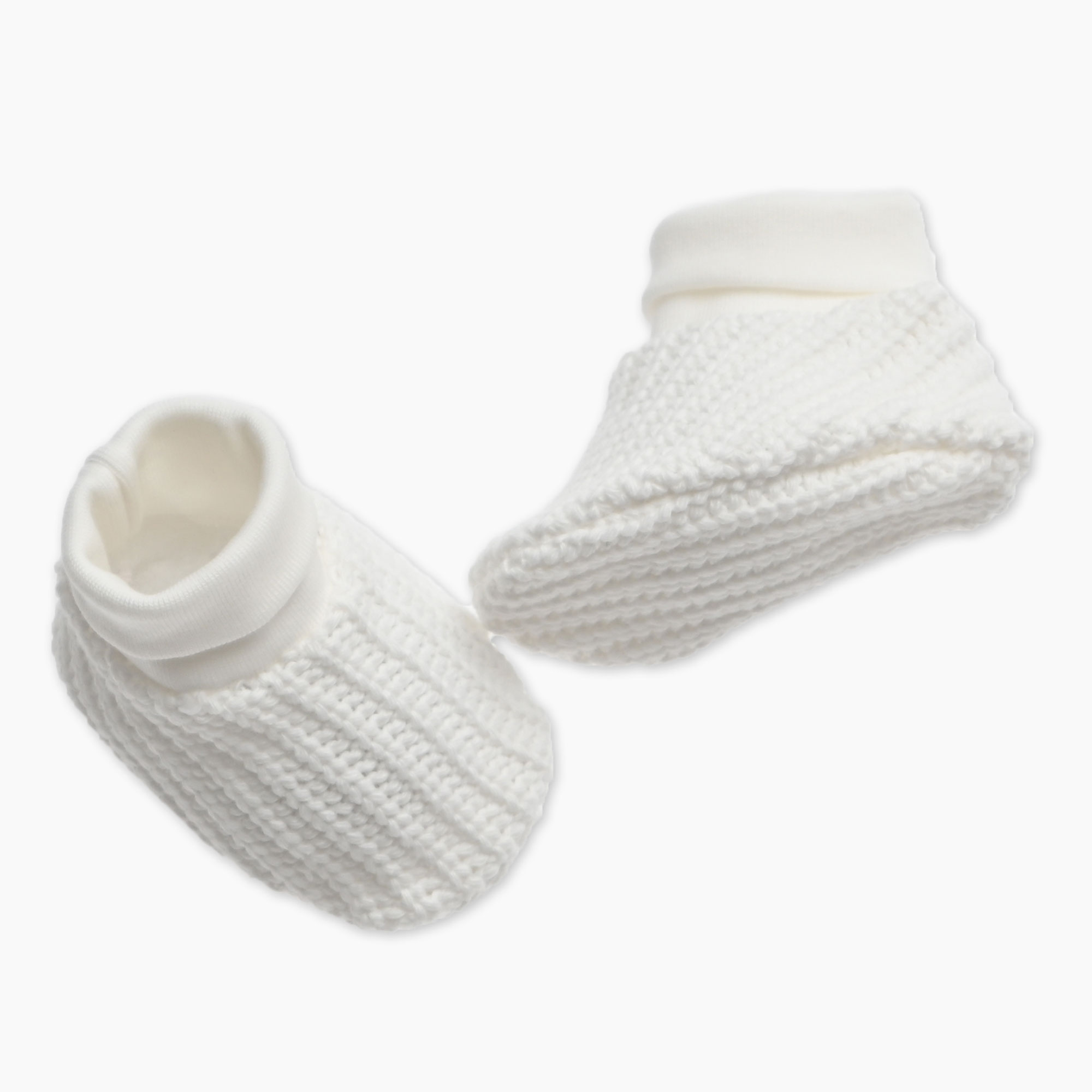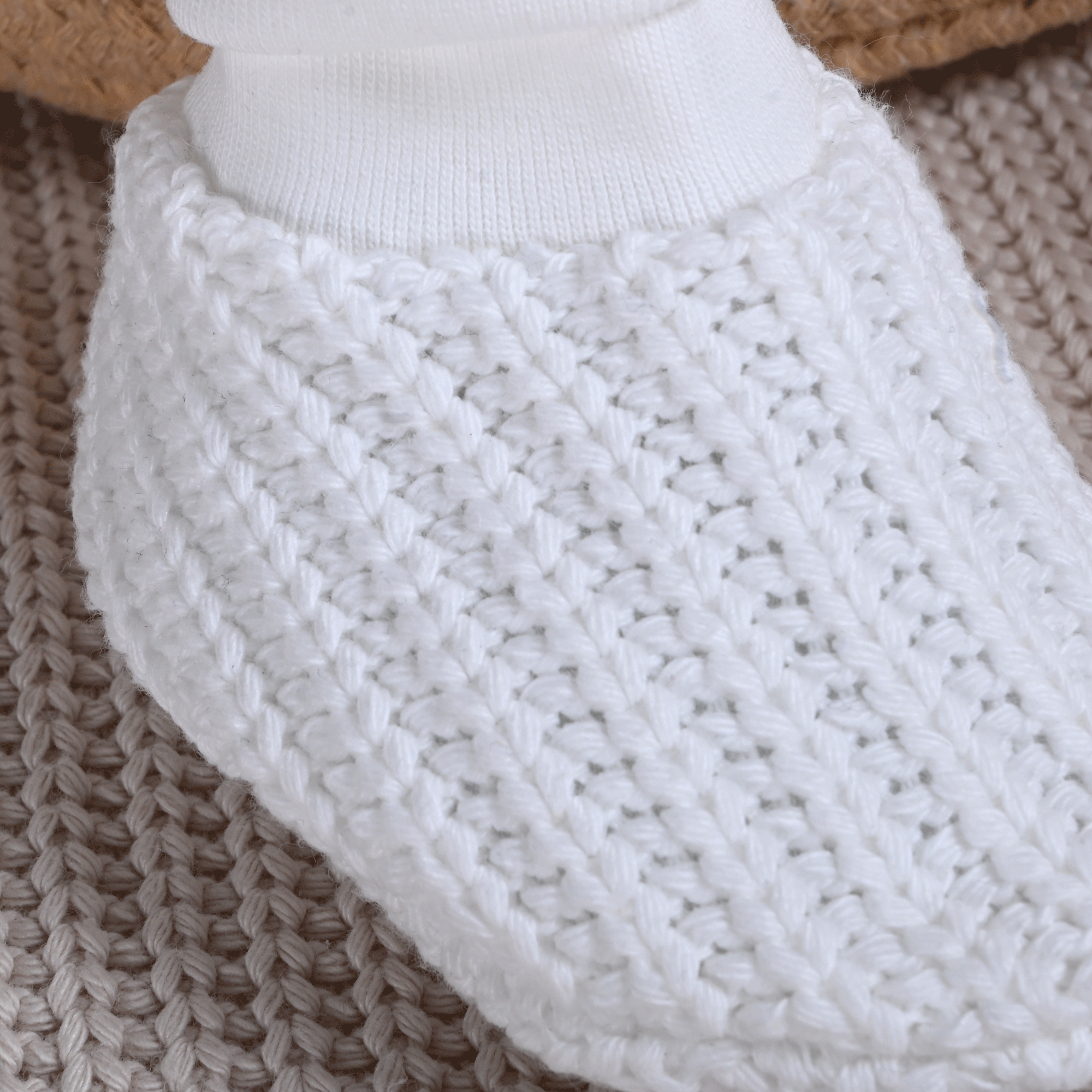 Nežni smetana otroški copatki za dojenčka, zasnovani za toplino, udobje in varno prileganje nogicam. Mehka pletenina iz 100 % bombaža zagotavlja prijetno mehkobo, zračnost in prijaznost do občutljive kože, medtem ko elastični patenti na zgornjem delu copatkov skrbijo, da ostanejo na nogicah tudi med brcanjem in gibanjem.