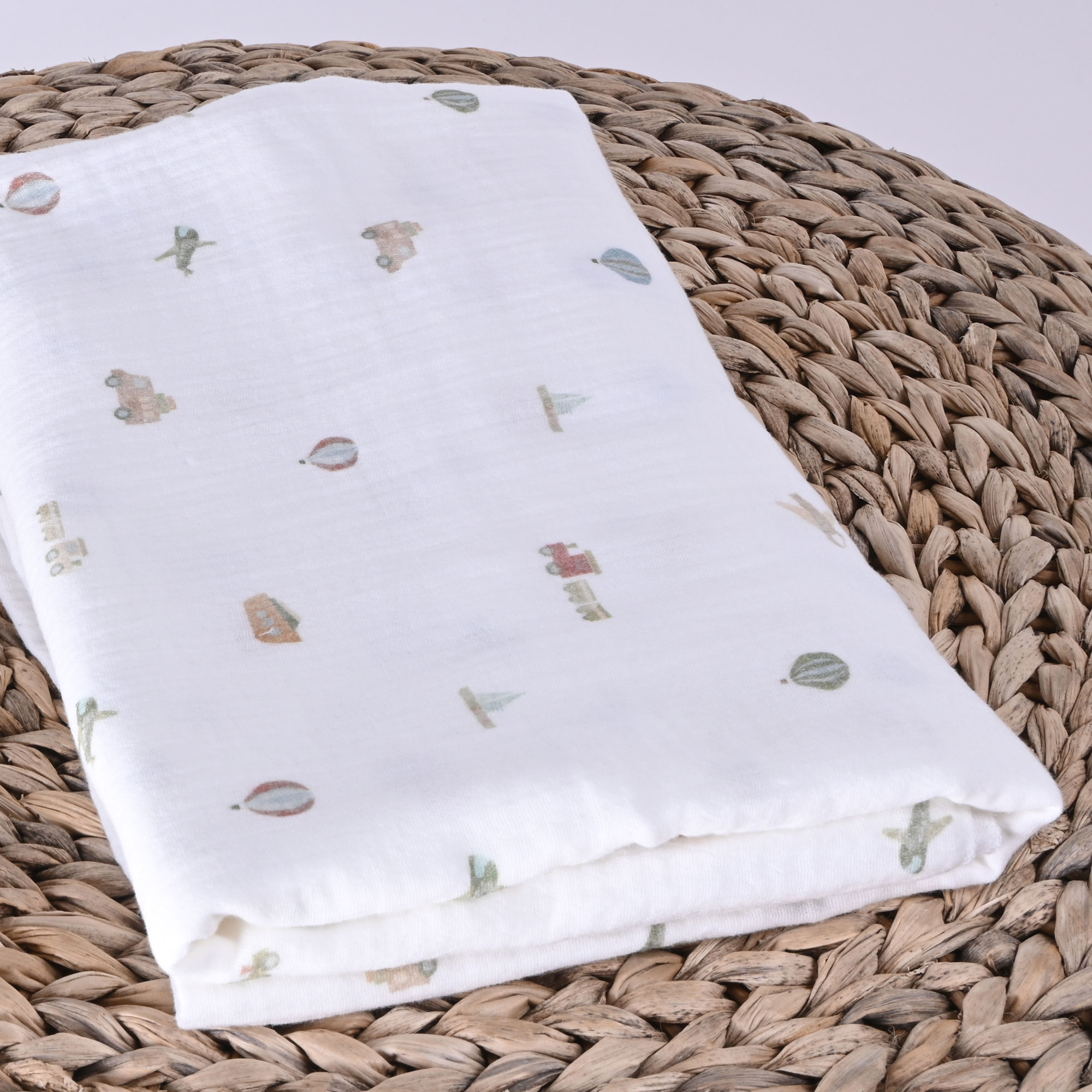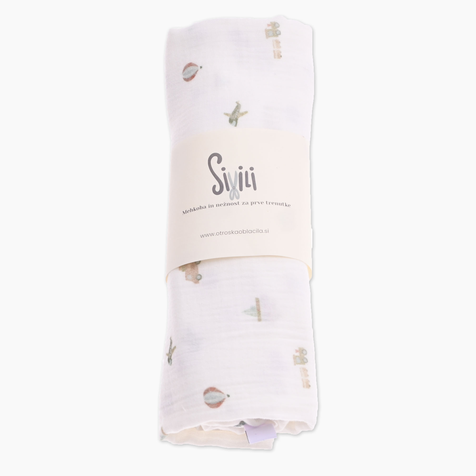 Mehka tetra plenica iz muslina z ljubkim tiskom balonov, letal in avtomobilov. Večnamenska uporaba – kot odejica, povijalna podloga ali zaščita. Narejeno v Sloveniji