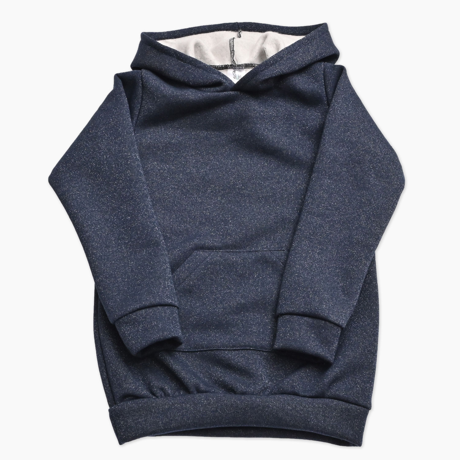 Temno moder otroški pulover za punčko z bleščicami, zasnovan za udobje, toplino in igriv, modni videz. Pulover ima kapuco in nepogrešljiv sprednji žep, ki dodaja praktičnost in otroški šarm.