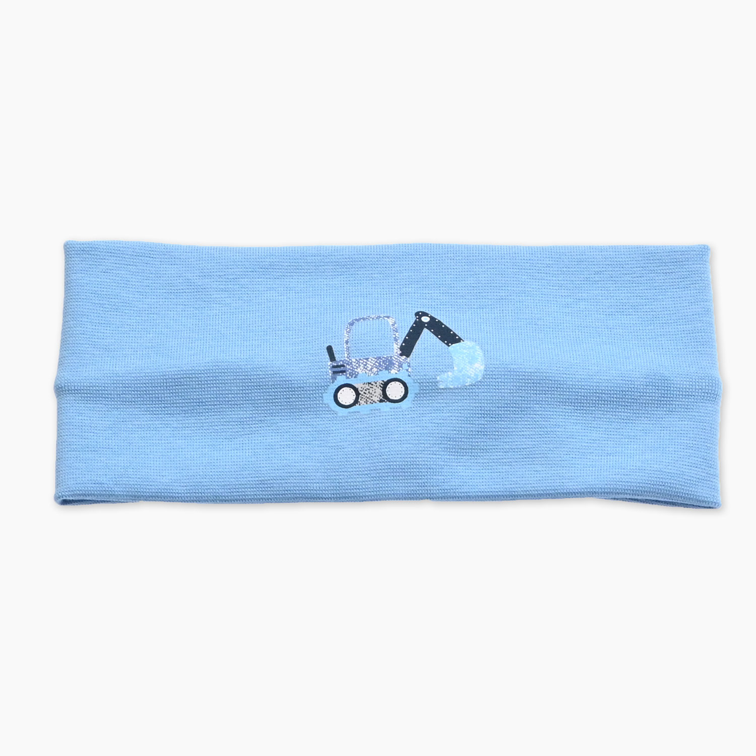 Otroški trak za zaščito ušes v svetlo modri barvi s tiskom bagra ki koplje