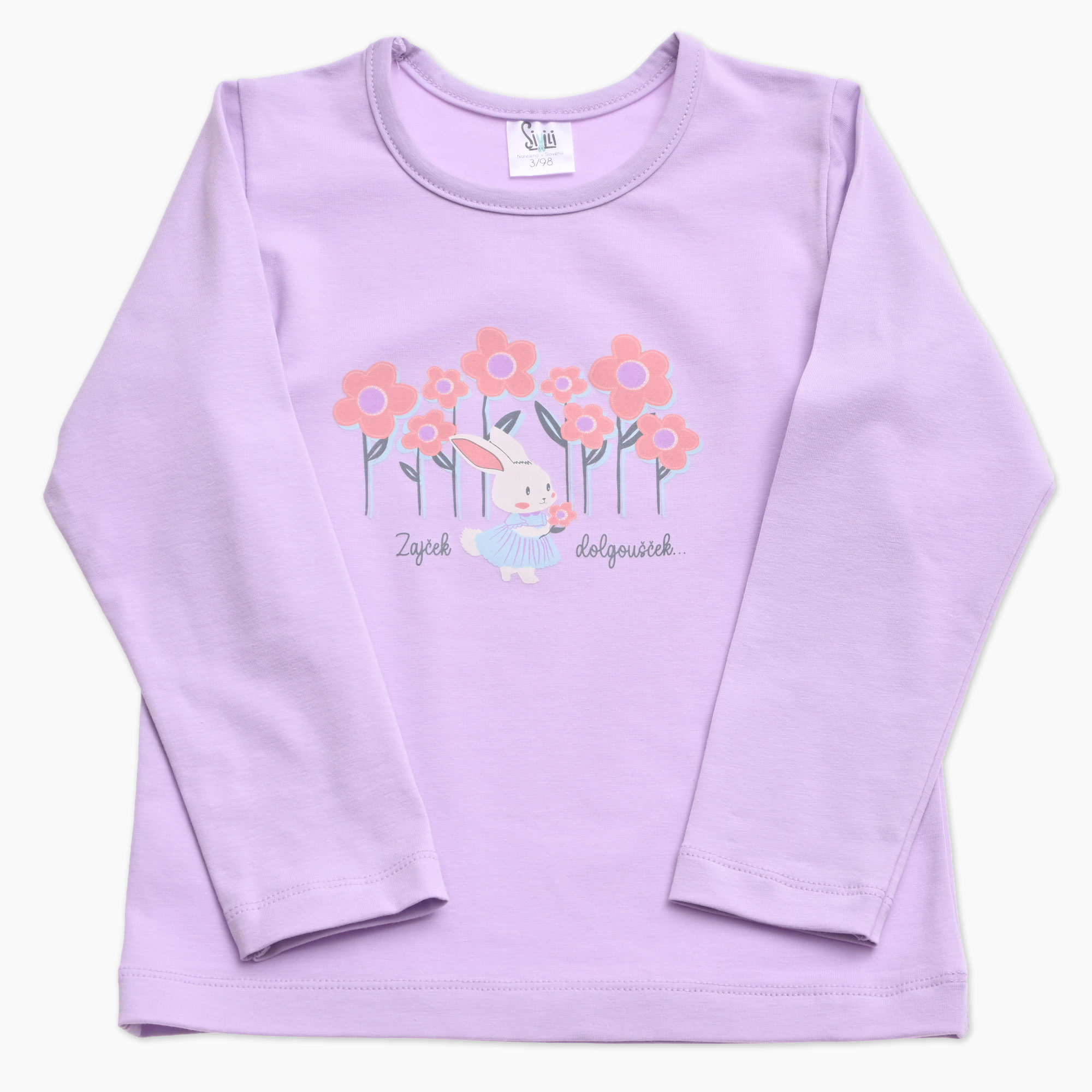 - lila barva z nežnim tiskom zajčka med rožicami in napisom ZAJČEK DOLGOUŠČEK
