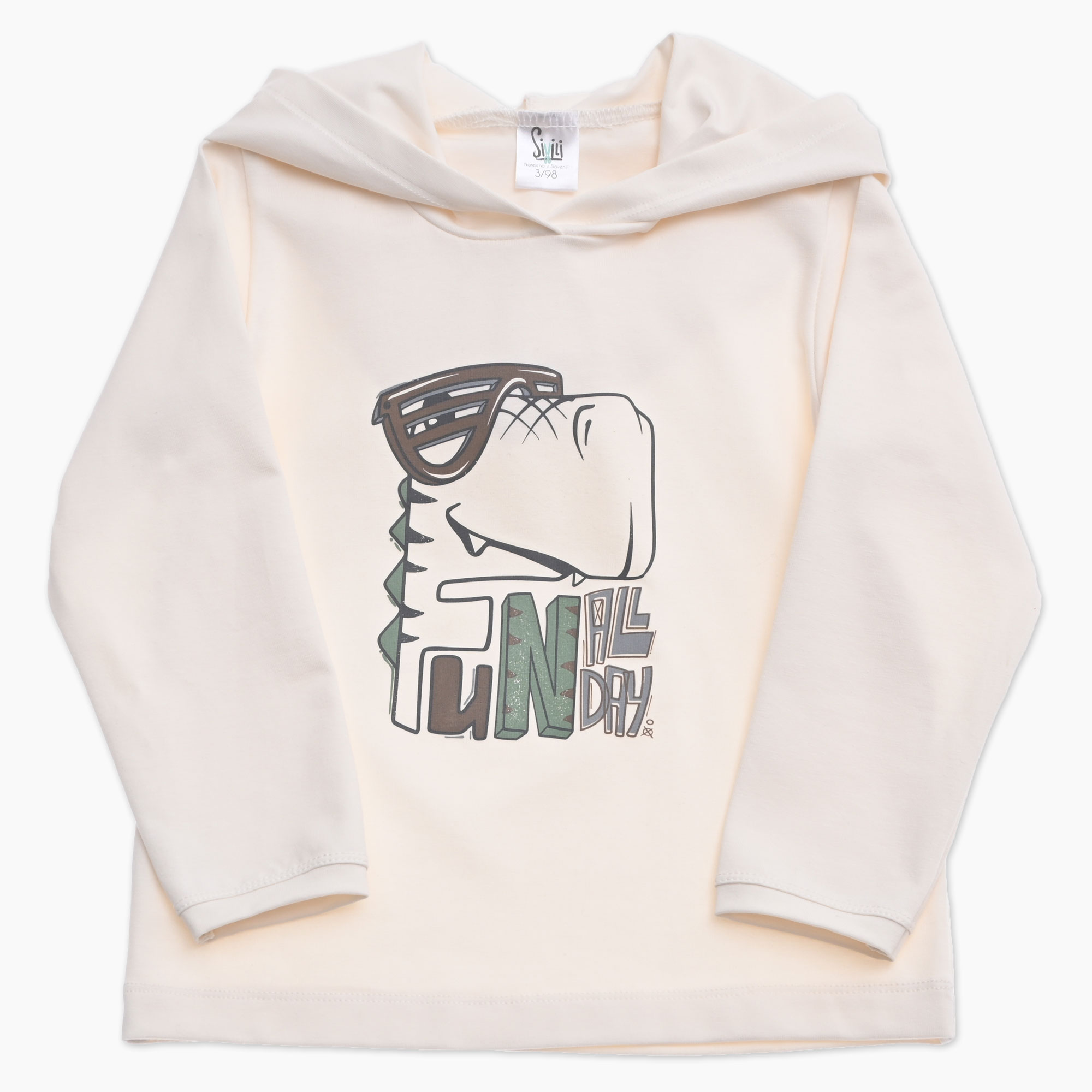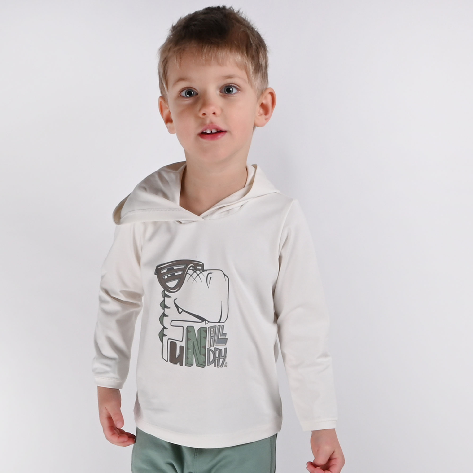 Otroška majica za fanta v smetana barvi s kapuco in tiskom dinozavra