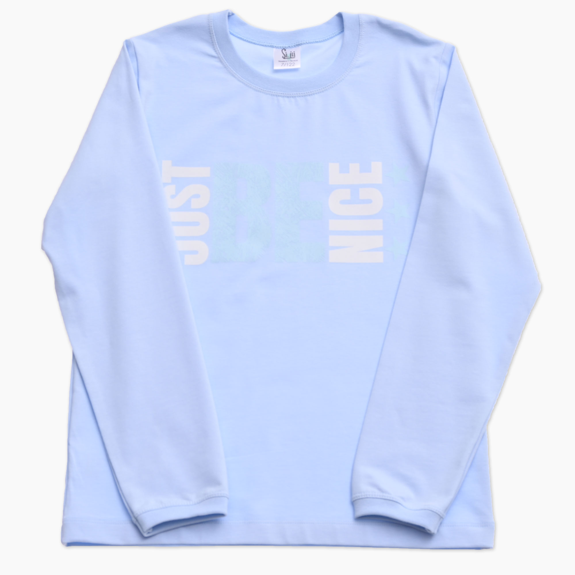 Otroška majica za fanta v svetlo modri barvi s tiskanim napisom JUST BE NICE