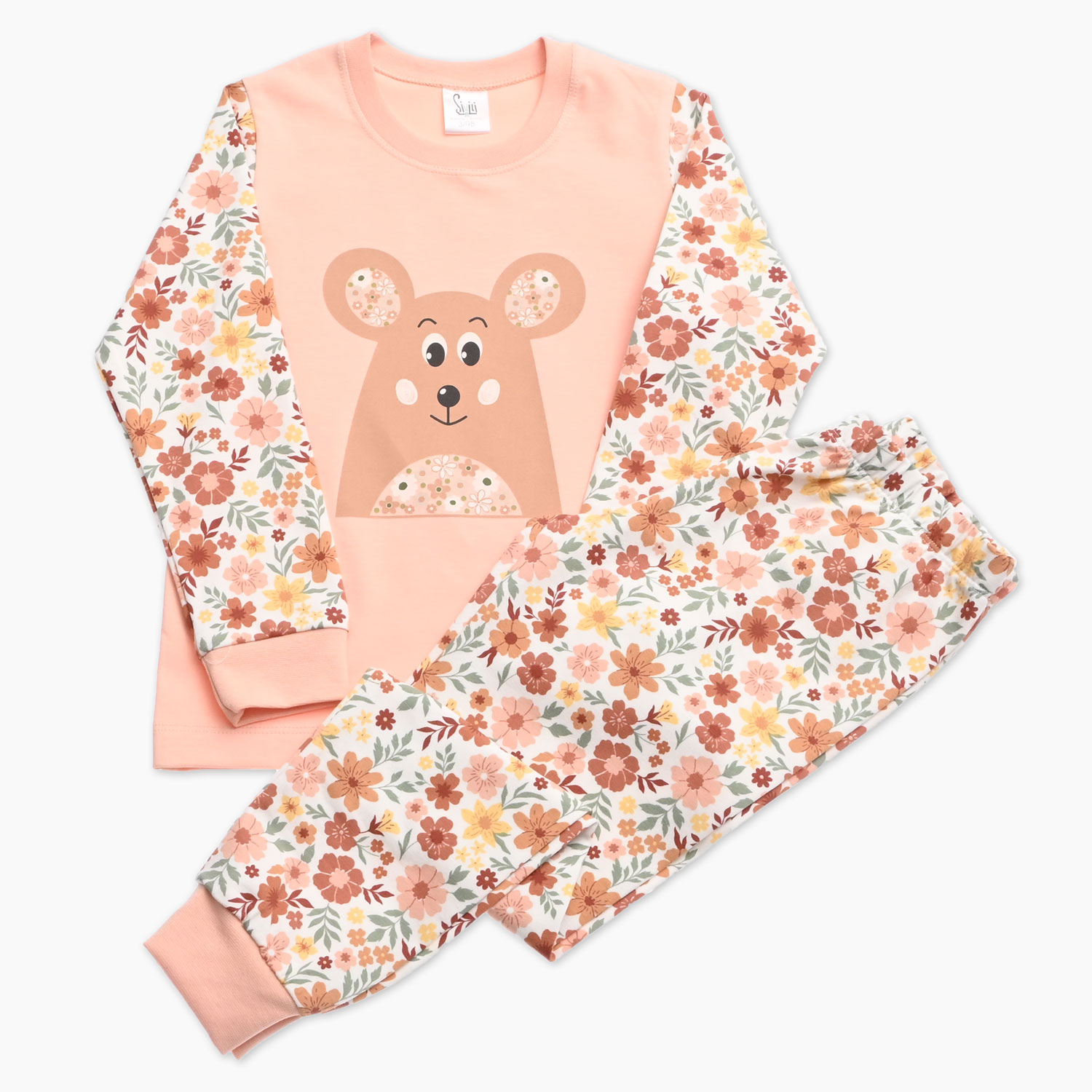 Zgornji del v marelični barvi krasi ljubek motiv medvedka, ki vabi v objem in sladkim sanjam. Rokavi in hlače so izdelani iz mehke tkanine s cvetličnim potiskom, ki čudovito dopolnjuje enobarvni del in ustvarja igriv, dekliški videz.