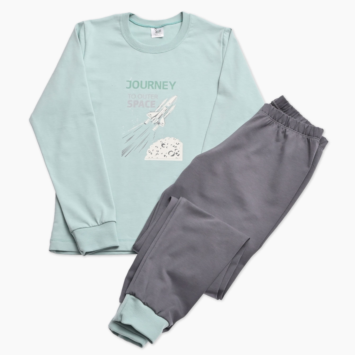 Otroška pižama za fanta v mint in sivi barvi s tiskom napisa in rakete