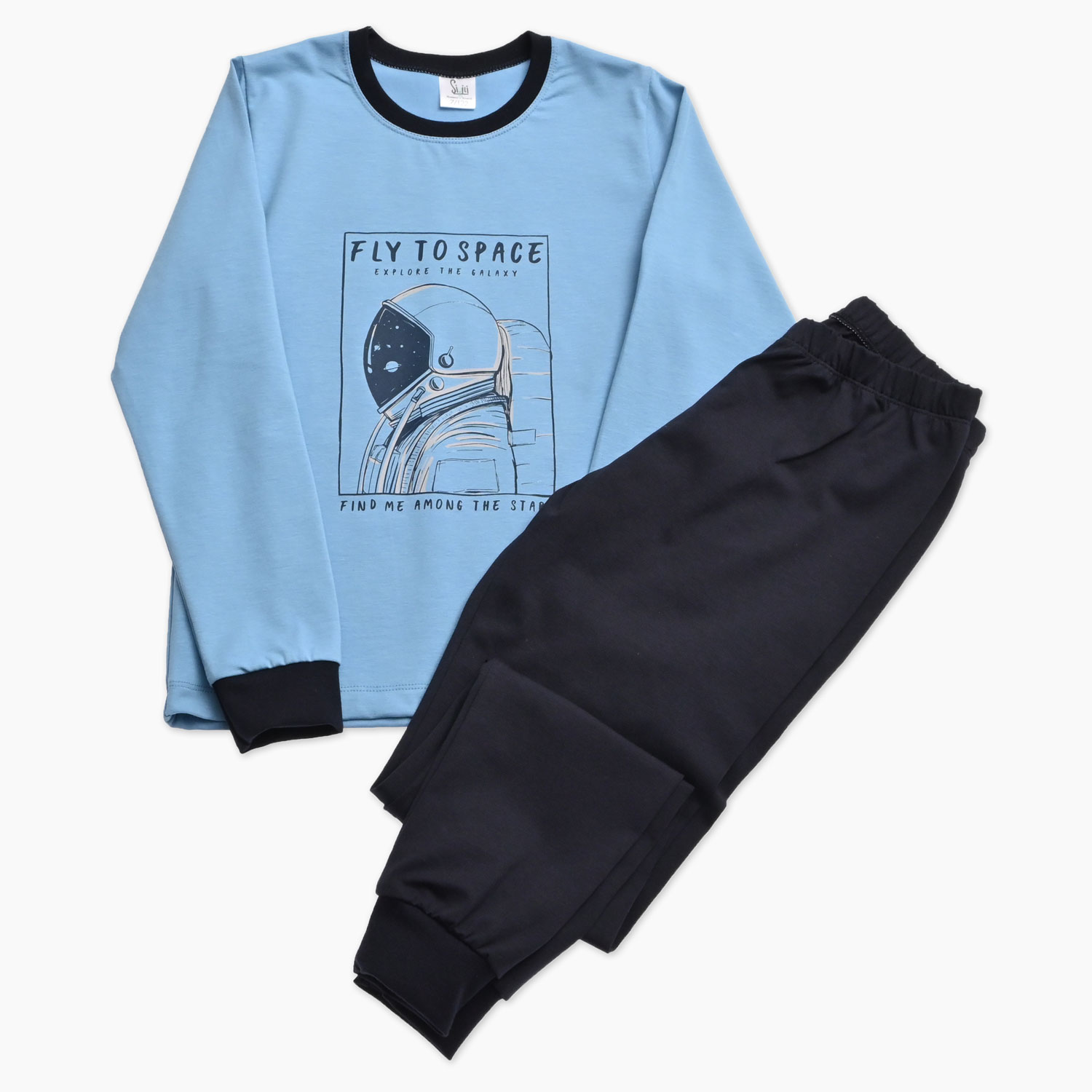 Otroška pižama za fanta v svetlo modri in temno modri barvi z napisom FLY TO SPACE